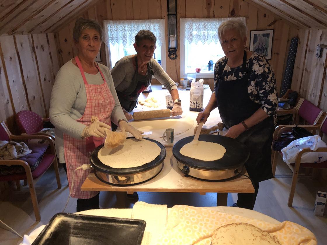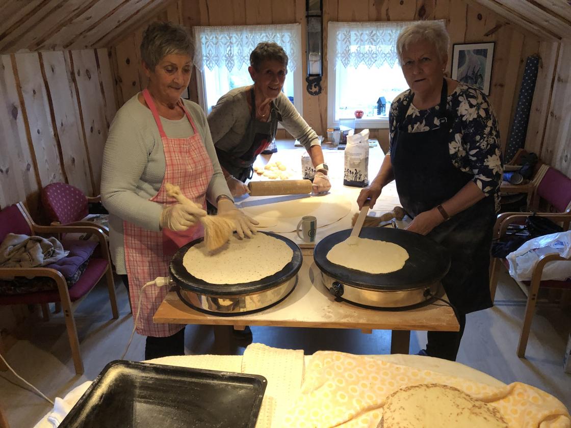 Tre medlemmer av Fitjar Bygdekvinnelag gjekk saman og bakte lefser og potetkaker i Bakehuset til LilliAnn Drønen no i adventtiden Og ja me hadde mange gode tanker om lefser og ikkje minst samtaler, og smaking av produkt, som er veldig viktig.