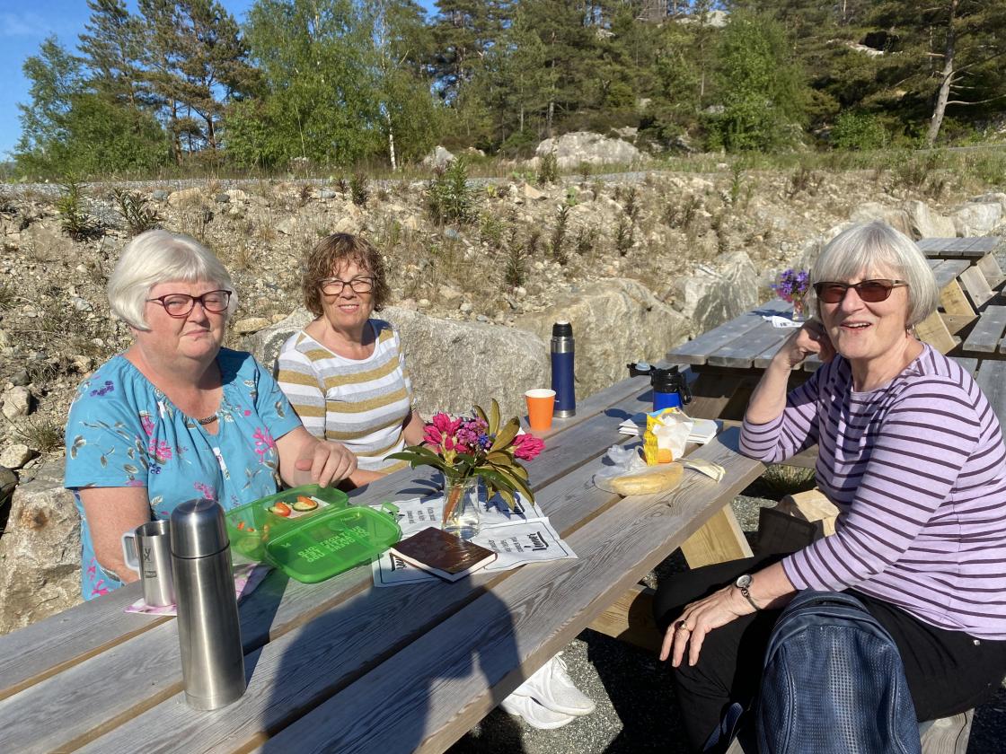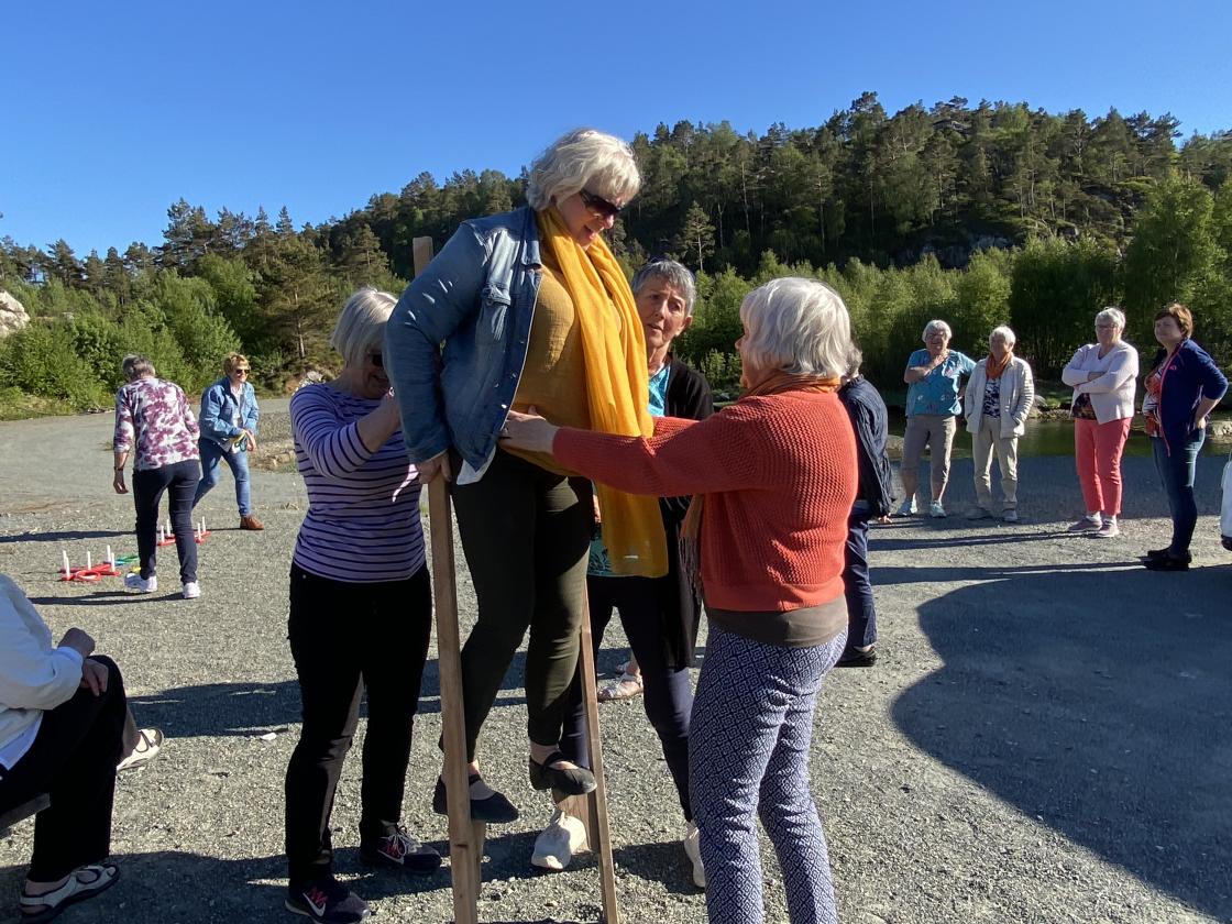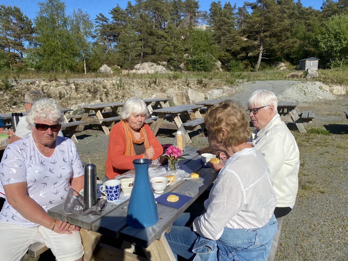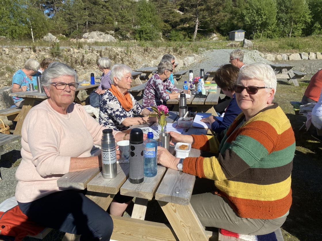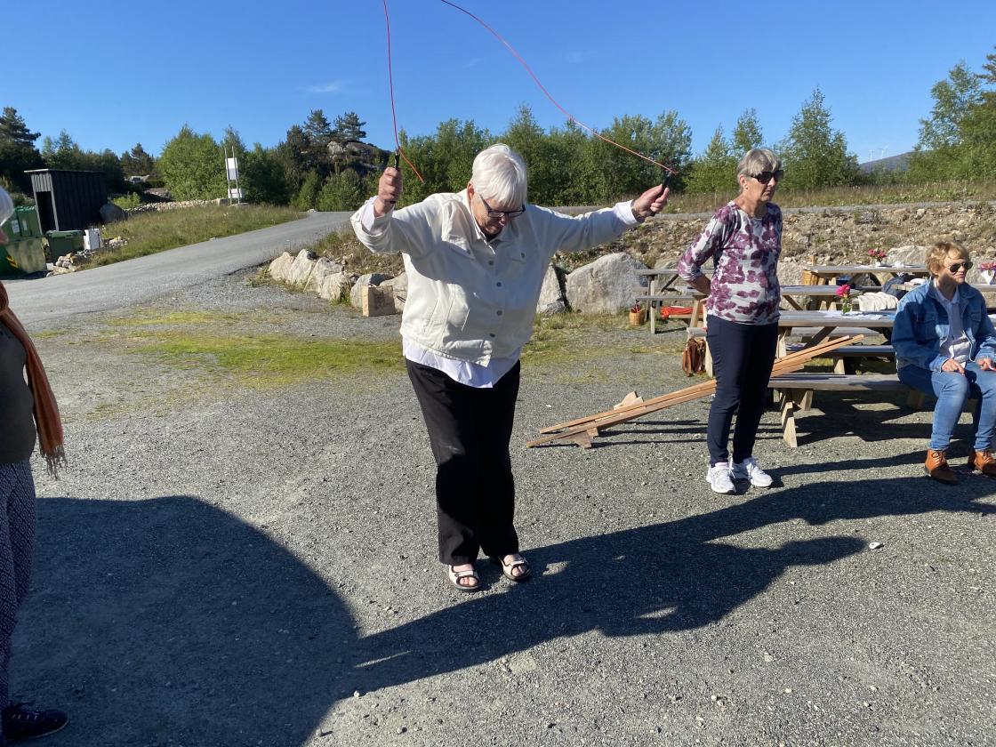 Nydeligt sommervær,kvar hadde kaffi med seg og noko å bita i. Me song ein fin sang til den vakre Fitjar bygda vår,, som er laga av Tora Vestbøstad. Ellers hadde me litt allsang og dikt lesing . Til slutt hadde me leker der nokon gjekk på stylter andre kasta ringer på blink, og me hadde kappgåing med egg. Veldig kjekk ettermiddag.