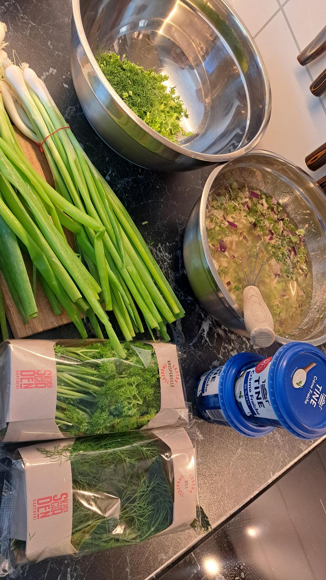 Med dykkarbrillene på, var det å setta igang med kutting av både raudlauk og vårlauk (kan informera om at å kutta vårlauk svir etterkvart like mykje i augene som ved å kutta vanleg lauk, så dykkarbriller er nesten eit påkrevd sikkerheitstiltak).