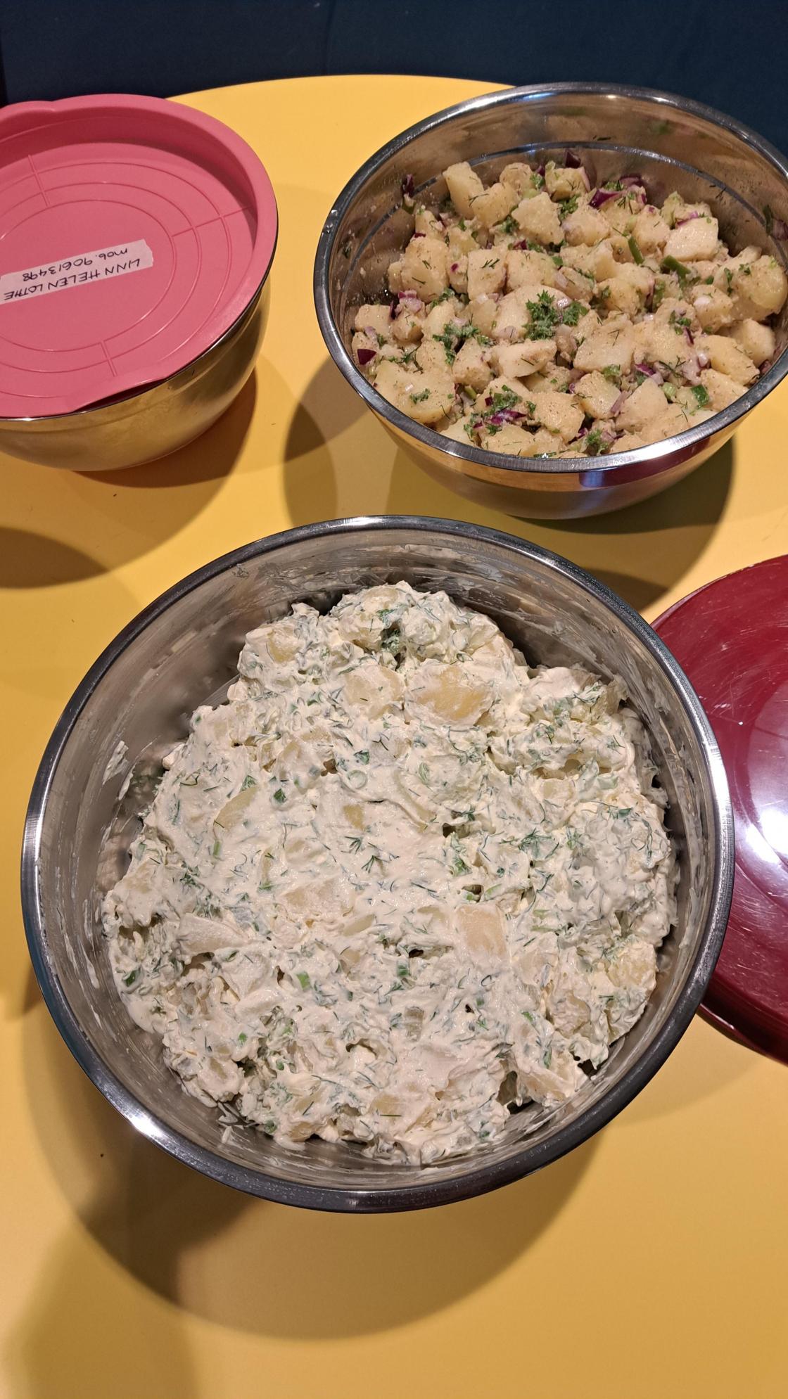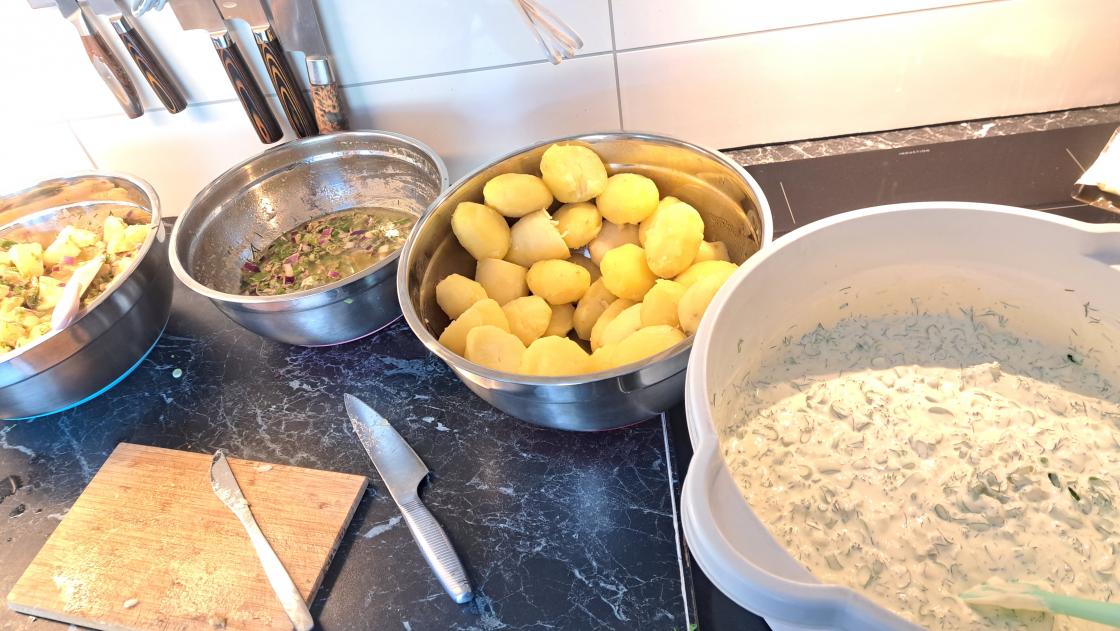 Rømme, majones og sylta agurk i frodig harmoni saman med lauk, persille og dill. Ei lita handfull med salt og eit dryss pepar. Litt sennep oppi her - ja det vert godt. Og vipps stod 4 støre bakebollar stappfulle av potetbitar dekka i god saus.
