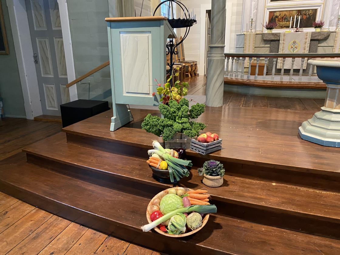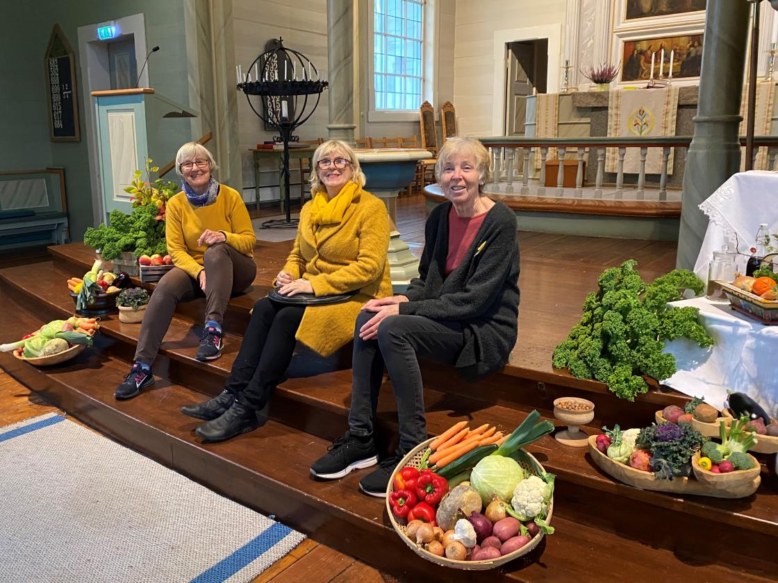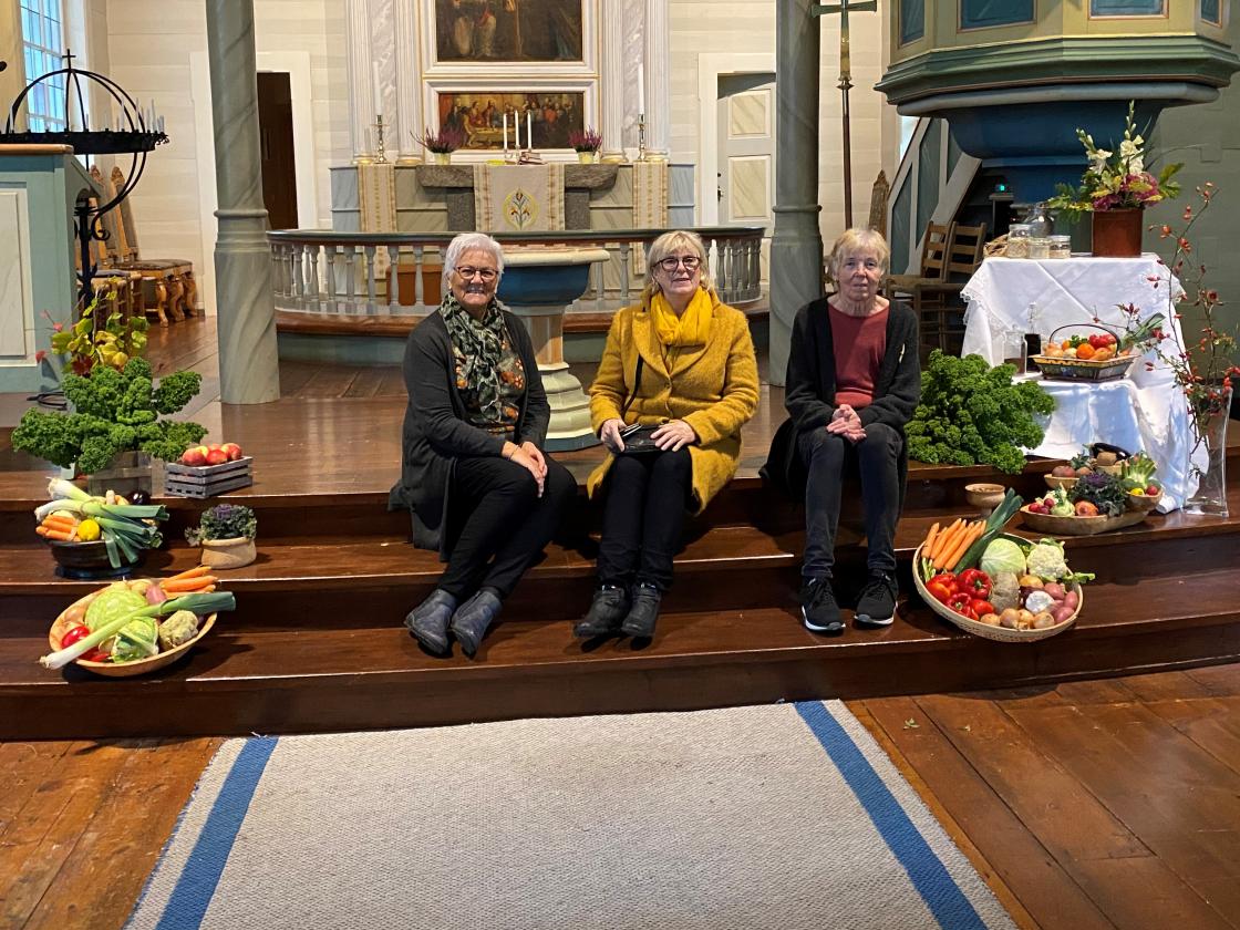 Fitjar Bygdekvinnelag pynta kyrkja til hausttakkefest.Medlemmene som var med å pynta var Toril Lyngvær ,Solveig Thomassen og Elin Korneliussen.