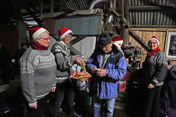 Nokre av medlemmene i Fitjar Bygdekvinnelag serverte julegløgg og pepperkaker.