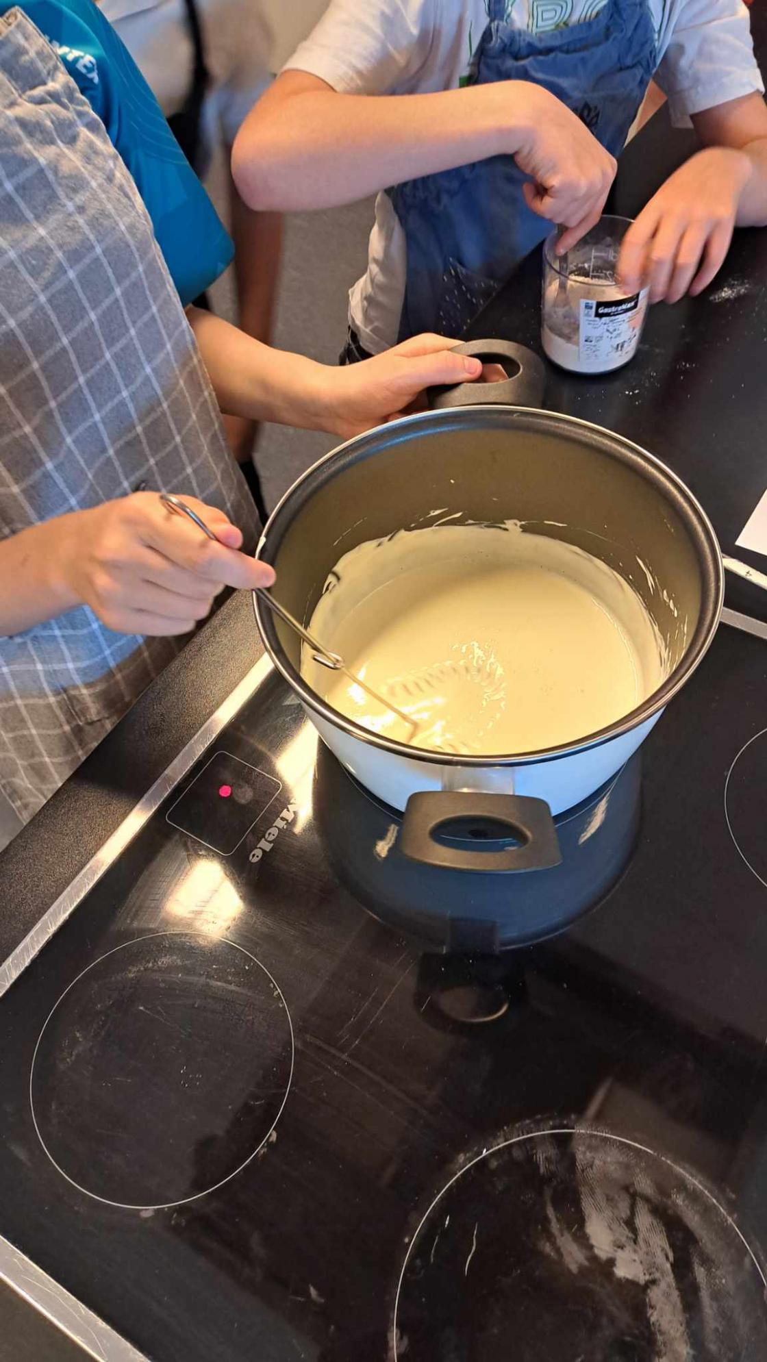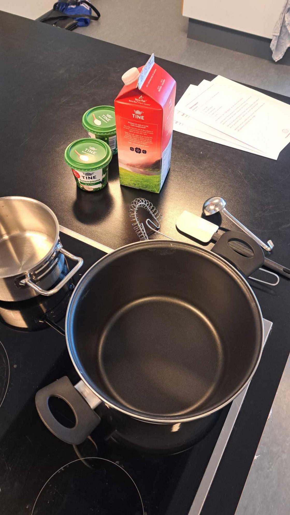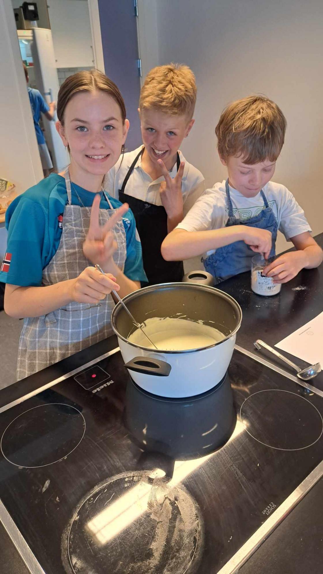 Elin, Marie og Linn Helen stilte som kyndige (i alle fall Elin!) rømmegrautlagarar på Rimbareid skule 16.mai. Saman med elevar frå klasse 6a, svinga me oss igang med både rømme, mjølk og mjøl.