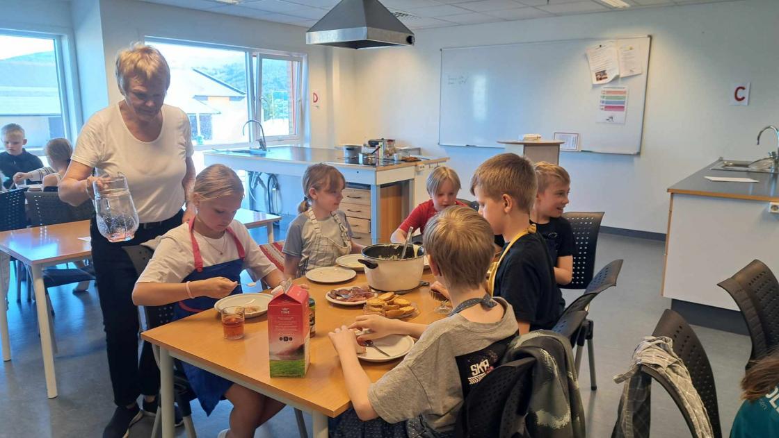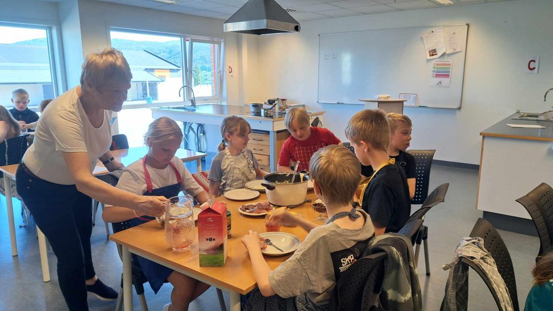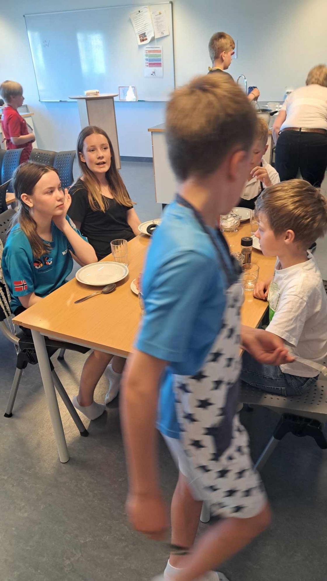 Sia vart det storfin servering kring fint dekka bord, og elevane åt villig vekk av både graut, spekjemat, kavring og rosiner. Saman med litt kanel, sukker og saft i glasa, vart det ei fin stund. Dei aller fleste syns grauten var god.
