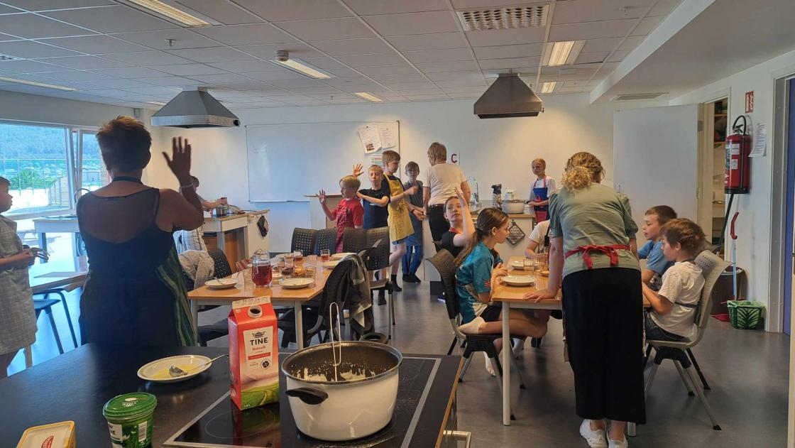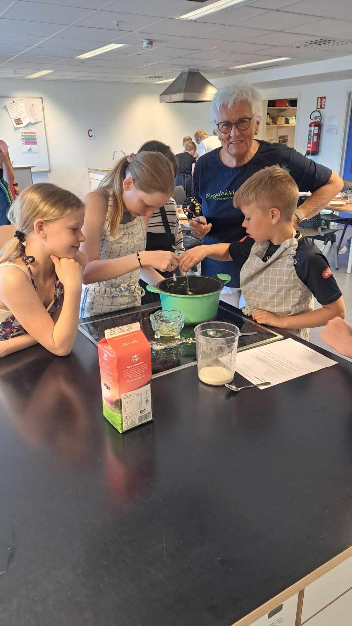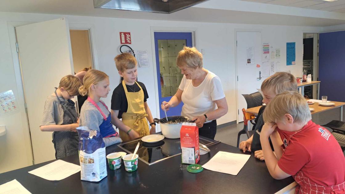 Tre damer frå bygdekvinnelaget var med 6a ved Rimbareid skule og laga rømmegraut frå botnen av 16.mai - akkurat i tide til 17.mai.