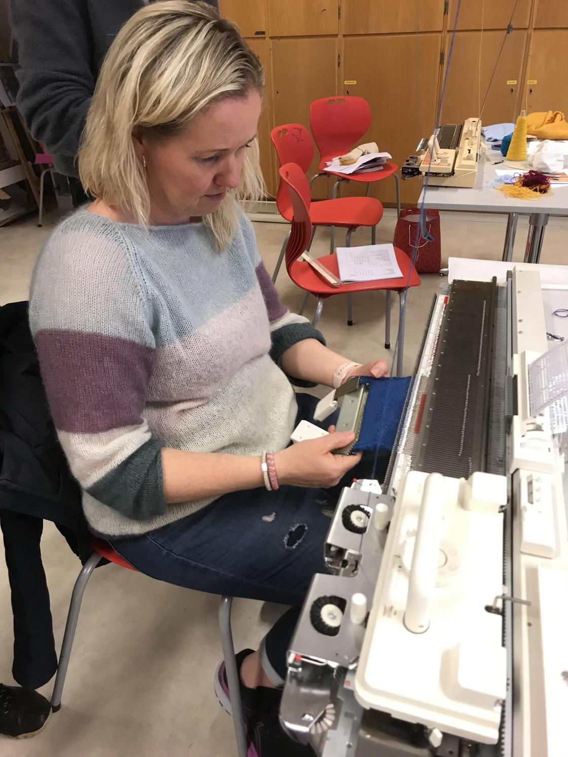 Under nøye opplæring frå strikkemaskindronninga Karoline Blix, var det engasjerte damer som sat med kvar si strikkemaskin. Nokon har gjort det litt før, medan Linn Helen var heilt nybyrjar.