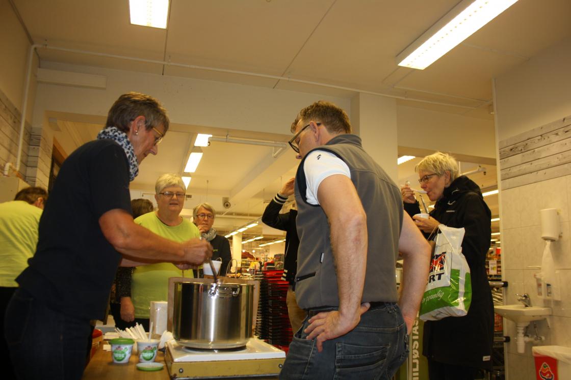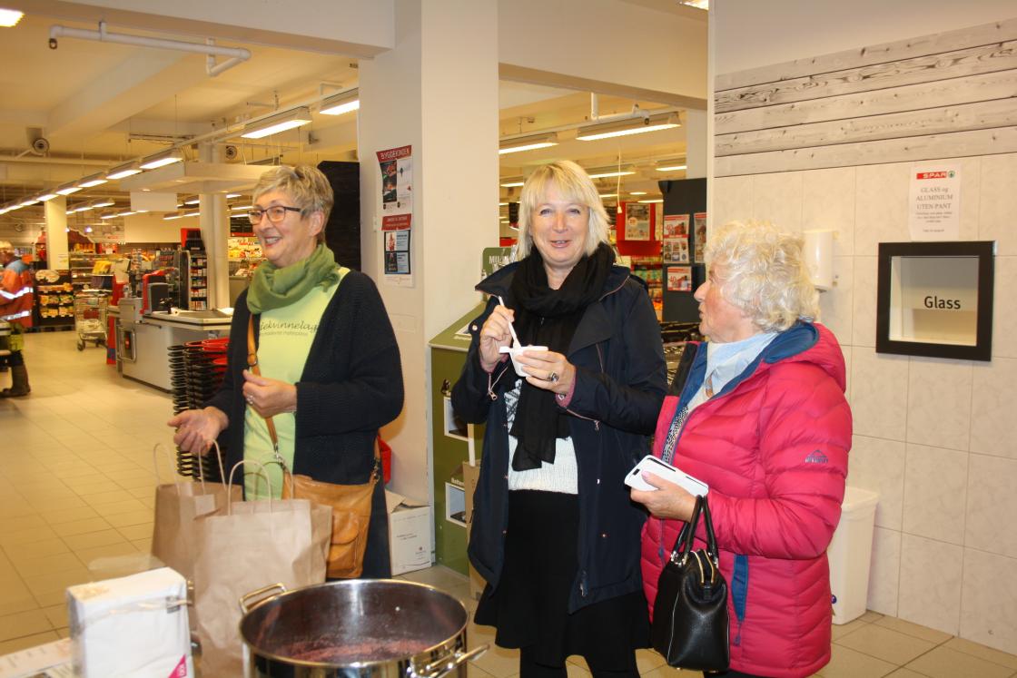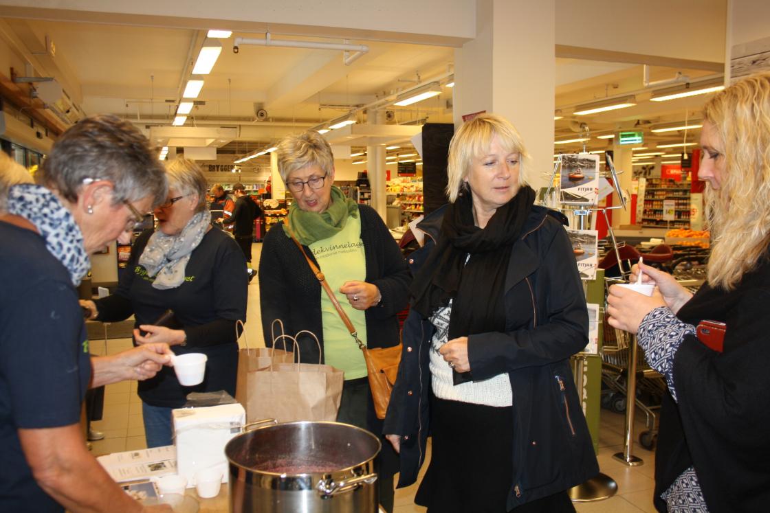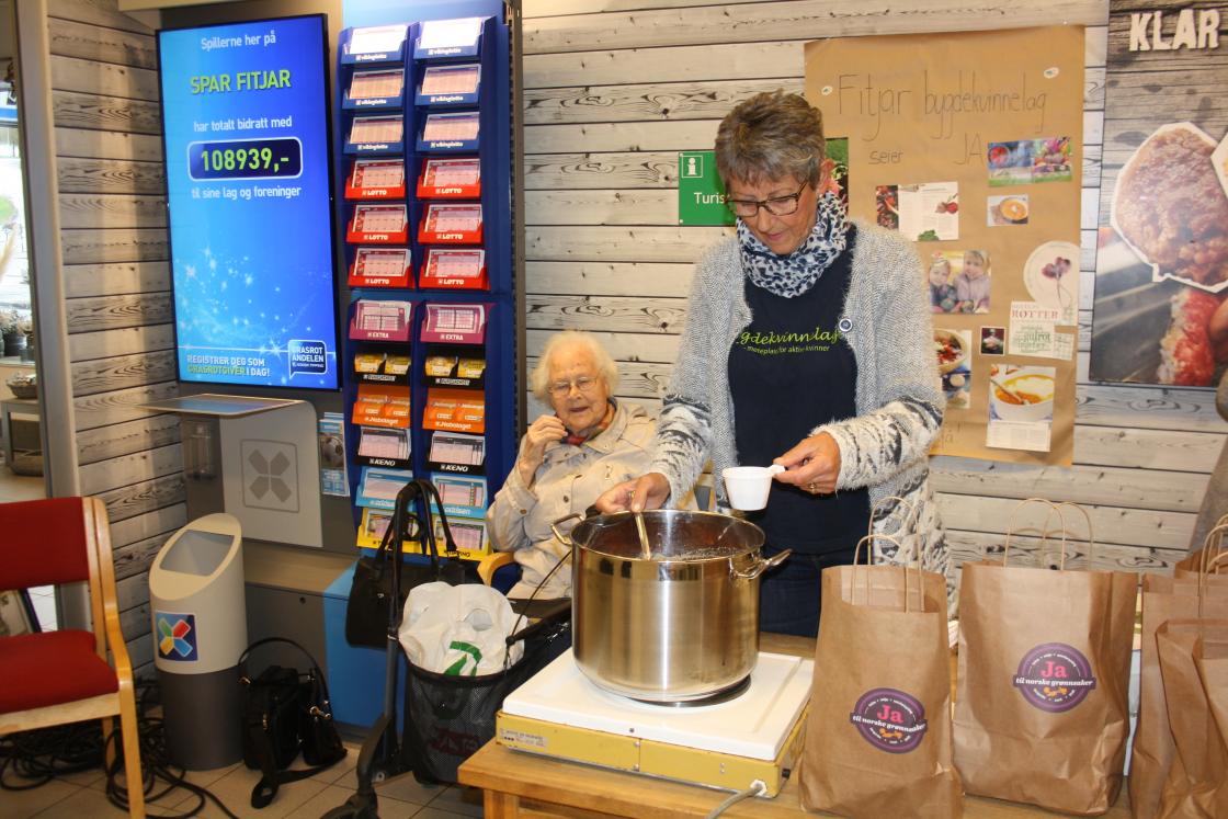 Idag er verdas Matvaredag. Me i Fitjar Bygdekvinnelag har laga grønnsaksuppe av norske rotgrønnsaker. Me har stått hos Larsen på Fitjar og delt ut smaksprøver . Me delte og ut poser med rotgrønnsaker og oppskrift på suppa. Desverre hadde me ikkje nok poser med rotgrønnsaker til alle .Suppa vart veldig god mange kom og smakte på den Ordføraren vår Wenche Tislevoll kom og å smakte på den, ho syns den var veldig god, den ville ho annbefale til andre ,sa ho. Mottoet er et meir norske grønnsaker.