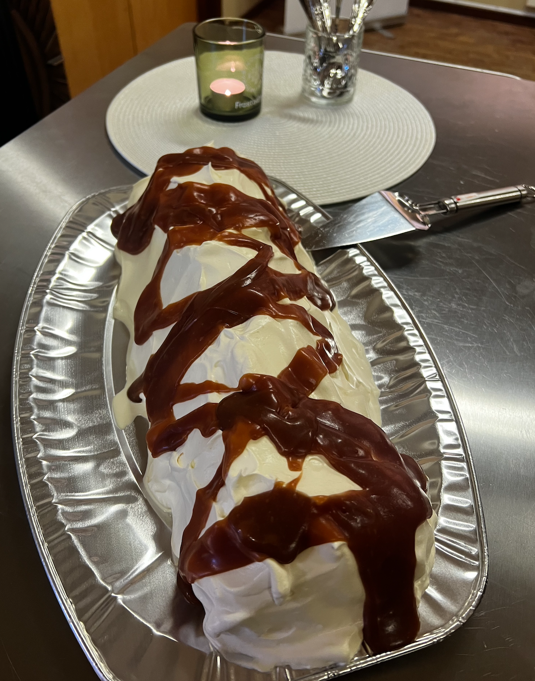 I går serverte vi påsmurte snitter, kake og kaffe.