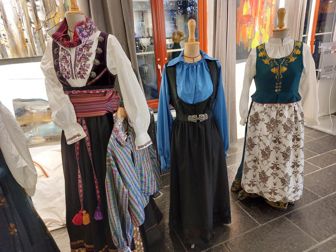 Til slutt svarte Solveig på spørsmål. Det var utstilt noen bunader i salen, og flere frammøtte hadde bunad på seg.