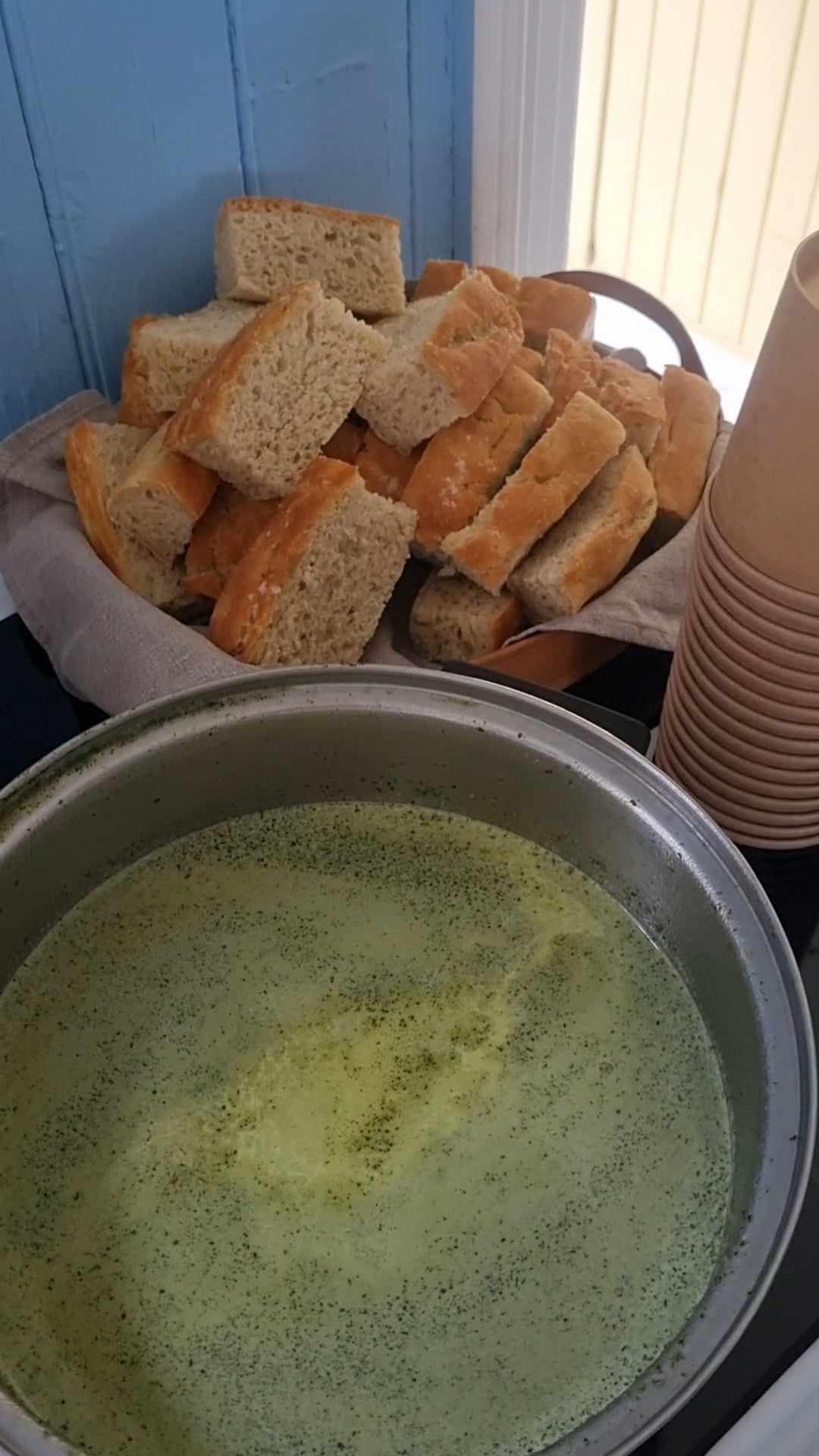 I kiosken solgte vi hjemmebakte kardemommeknuter, superlokal og i sesong nestlesuppe, med brød, og rabarbrasuppe med krem, is, samt kaffe, te og kald drikke.