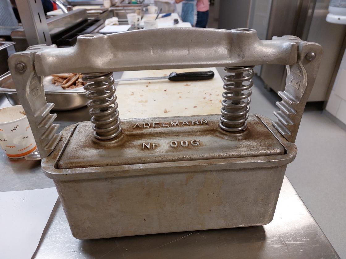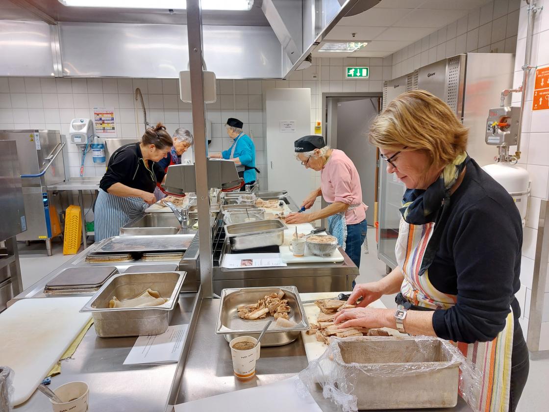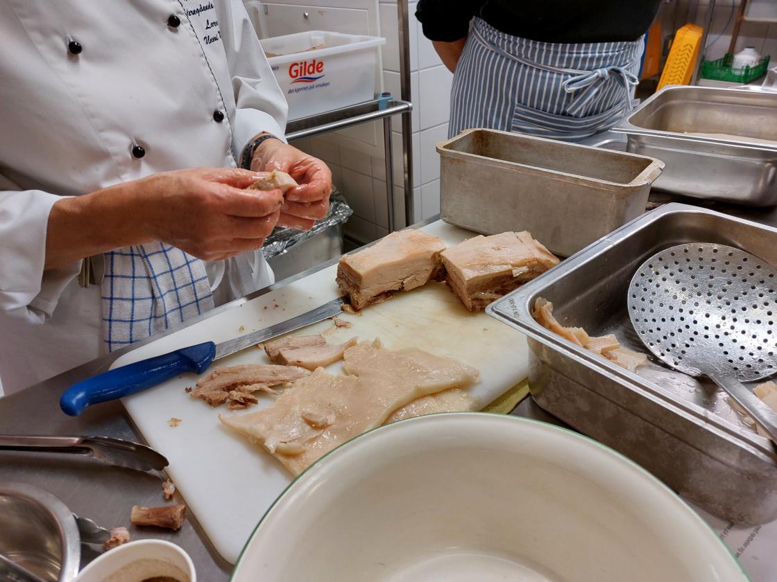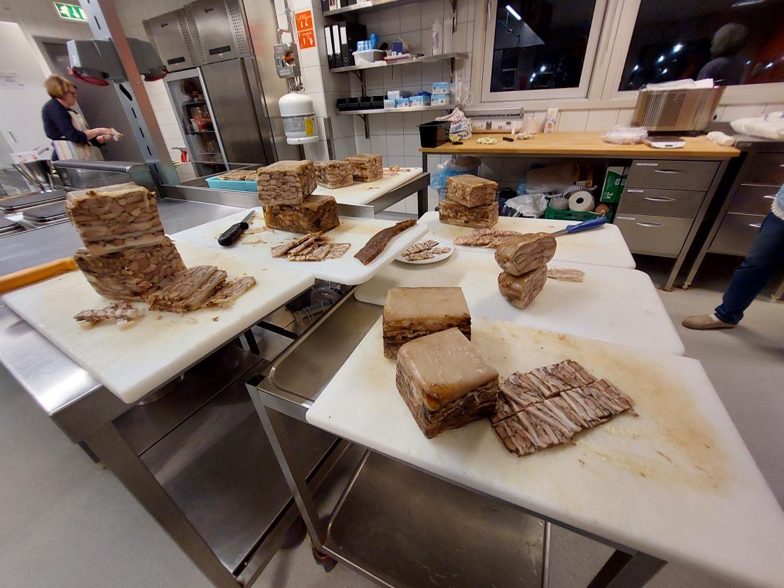 Kursdeltakerne fikk instruksjon om hvordan ferdig kokt kjøtt og svor skulle skjæres og legges i plastfolie (Kling-film som tåler varme) i syltepresse. Vi fikk også oppskrift på sylte i klede. Svoren skulle legges med Svorsiden ned. Deretter ble kjøtt og fett lagt lagvis med krydderblanding og gelantin mellom lagene og spekk og svor på toppen. Lokk ble satt på syltepressa, som ble satt i dampbad ca en time. Mens vi ventet viste Unni oss rundt i den imponerende matlagings- og restaurantavdelingen på skolen, som har 100 elever på kjøkkenfag. Etterpå skulle syltene presses mest mulig ned i formen. Her hadde vi god hjelp av kursets mannlige deltaker. Syltene ble så satt til avkjøling til neste dag.