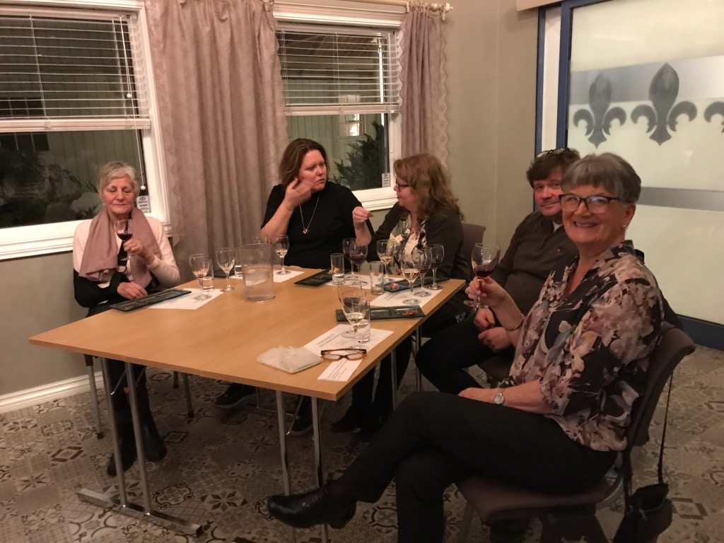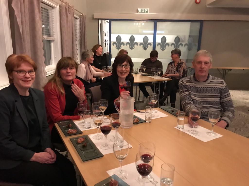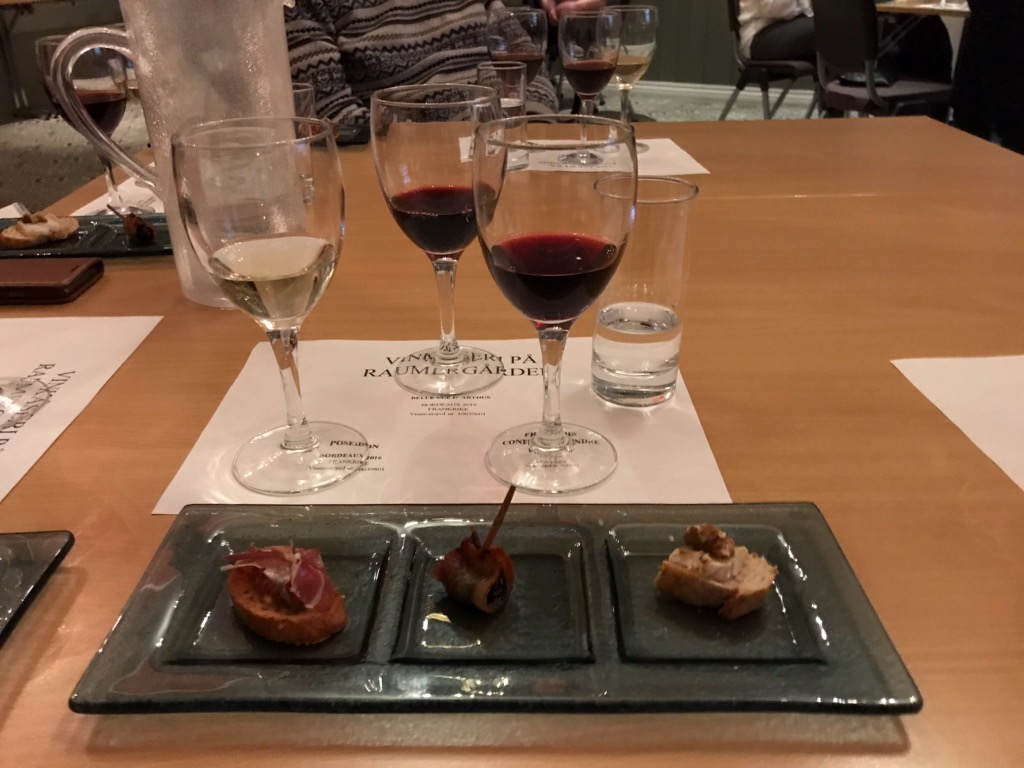 Vi testet alle tre vinene til tre små smaksprøver fra kjøkkenet. Ost (tørr chevre) smakte godt til hvitvinen. Den første rødvinen smakte godt til sviske i bacon og den andre passet bra til spekeskinke.Flere deltakere fikk svar på spørsmål om vin. Underveis fikk vi et råd om å kjøpe vinflasker med skrukork. Naturkork er en knapphetsressurs, og det danner seg lett bakterier etter at flaska er åpnet.