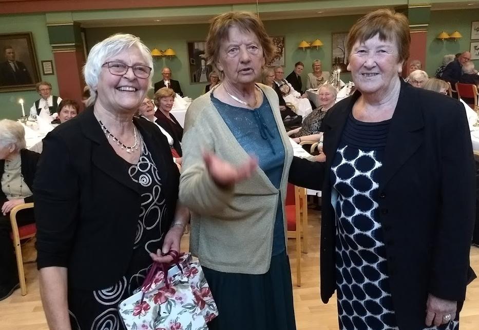 Emma Alme (i midten) og Jorunn Sande (til venstre) fekk utdelt ei Noregs bygdekvinnelagstavle som takk for engasjert medlemsskap i over 40 år.