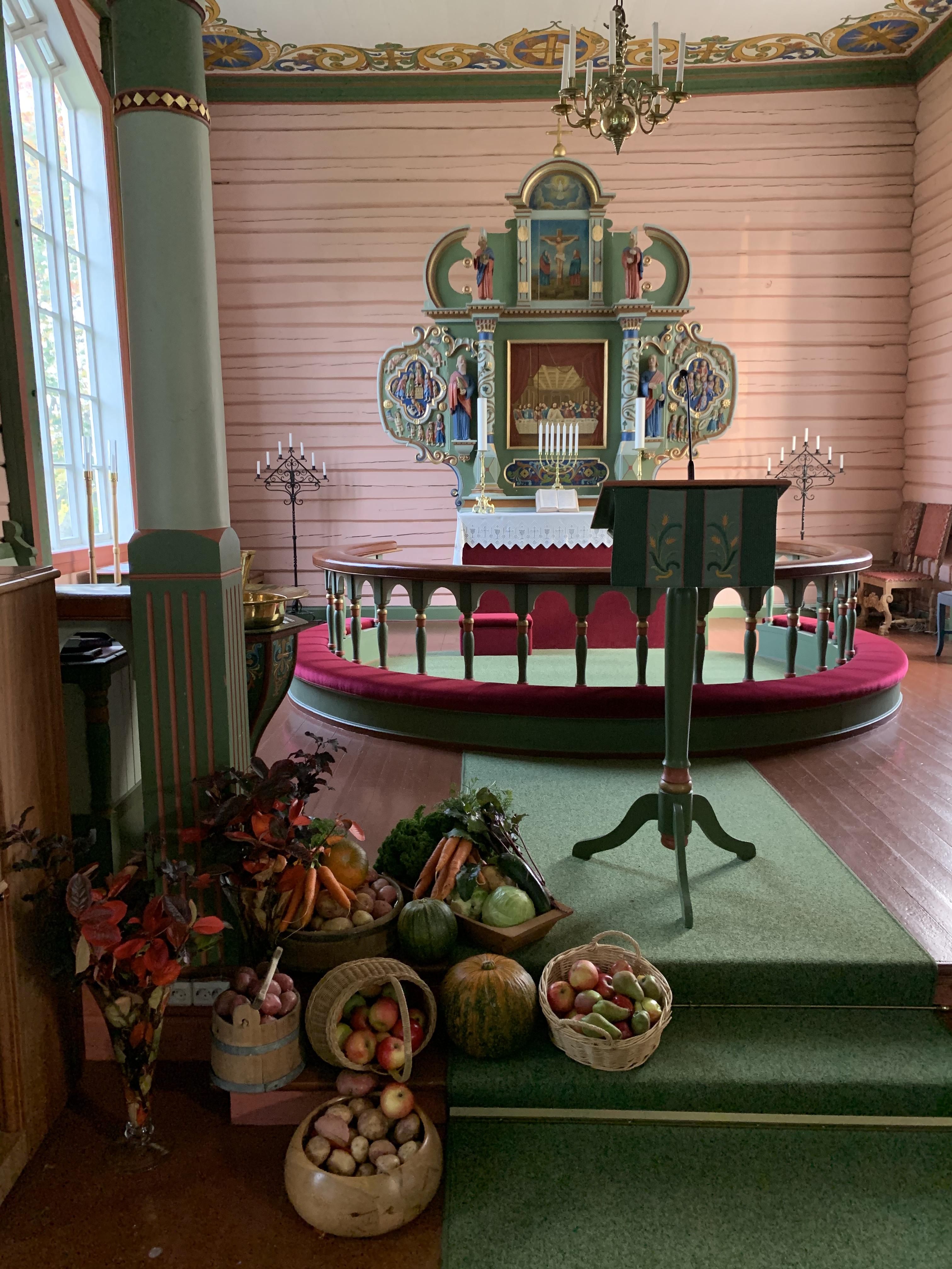 Kyrkja er nydeleg pynta med markens grøde og flotte haustfargar
