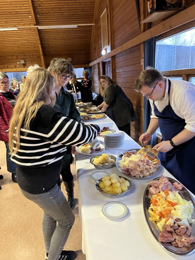 Etter omvisningen var det duket for årsmøtemiddag og kulturkveld, og kjøkkengjengen i Heddal serverte en utmerket tradisjonsrett fra Heddal: Salt kjøtt med kål, rotgrønnsaker og poteter. Kakebordet stod klart straks etter, og så ble det revykveld i regi av Ruben Kvålseth og Tor Olav Aase Kåsa.