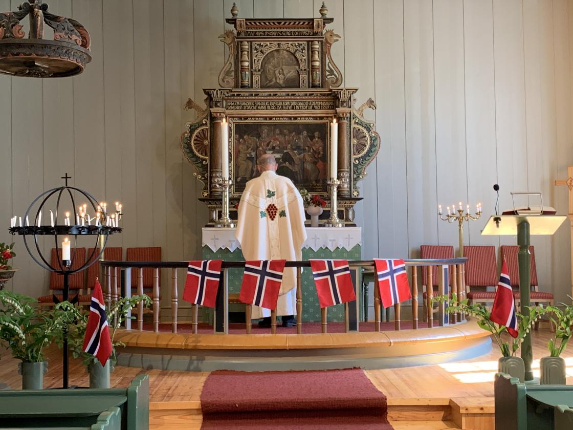 Hillestad kirke var nesten fullsatt med festkledde på nasjonaldagen og sognepresten hadde også kledd seg i det fineste han hadde.