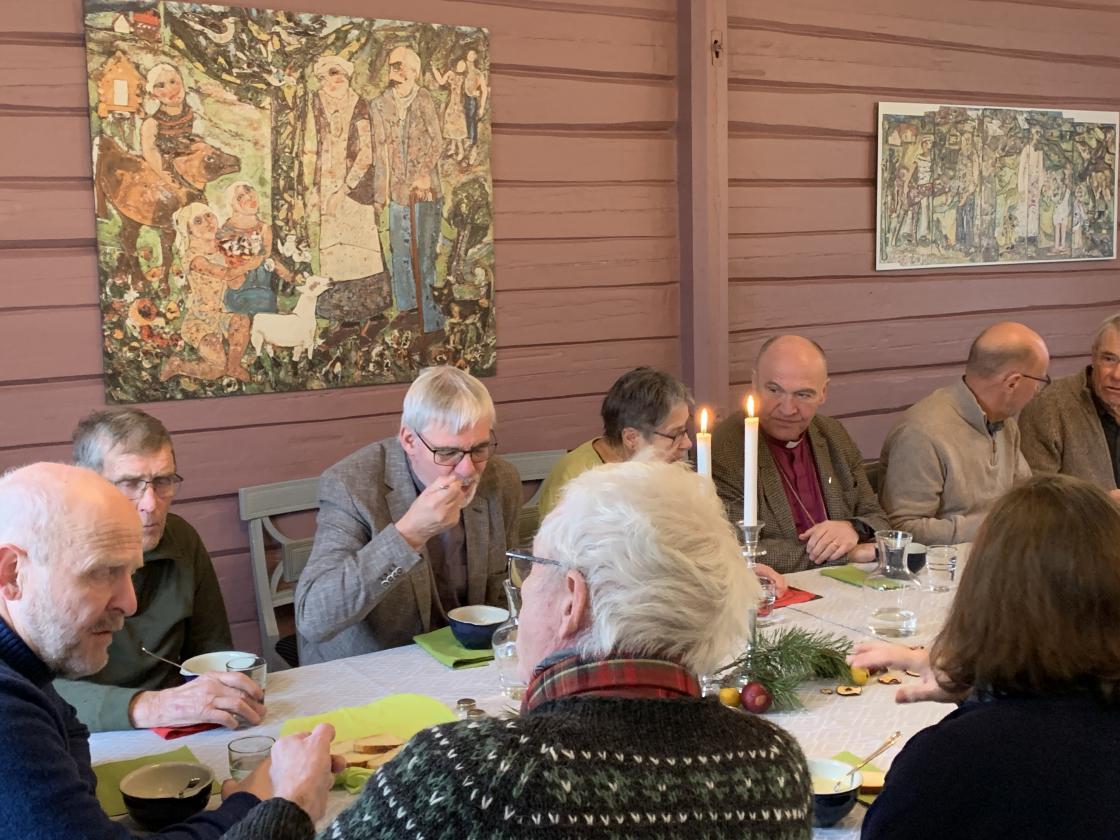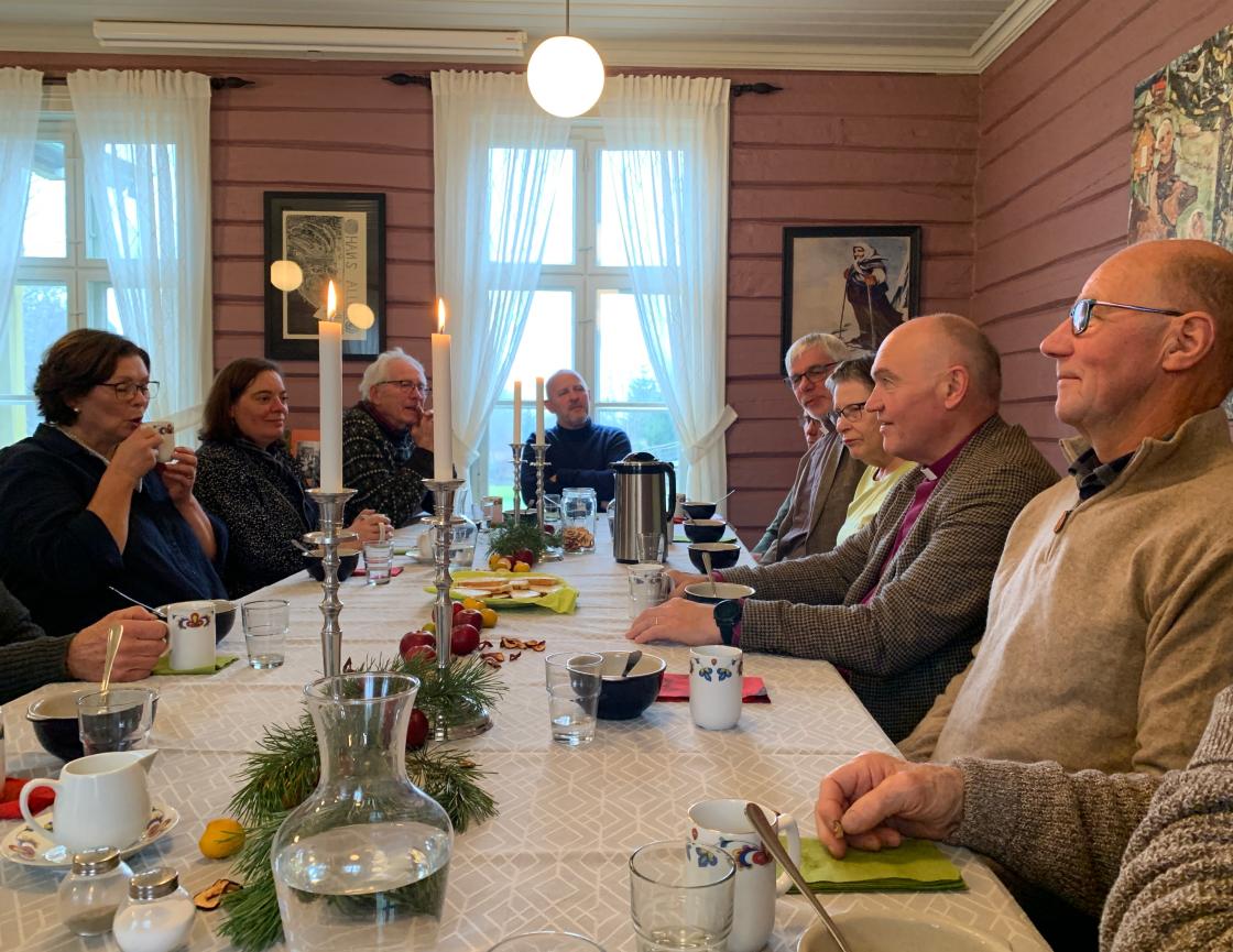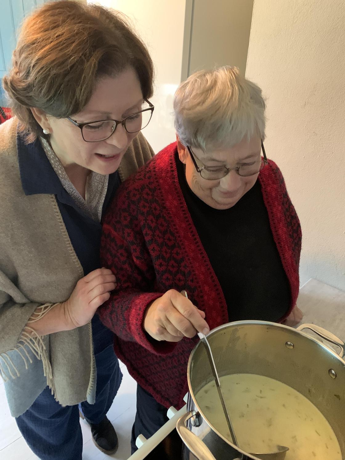 Hillestad bygdekvinnelag ved Åse Kristine Guthus og Anne Berit Finden hadde laget deilig kjærlighetssuppe og nybakt loff. Flere frivillige fra både HBK og RT, Museumsforeningenog Hillestad Utvikling var tilstede og vi nøt et godt måltid med hyggelige samtaler rundt langbordet i stua før Jan Otto med en liten hale av medarbeidere dro videre til kirkekontoret i Hof.