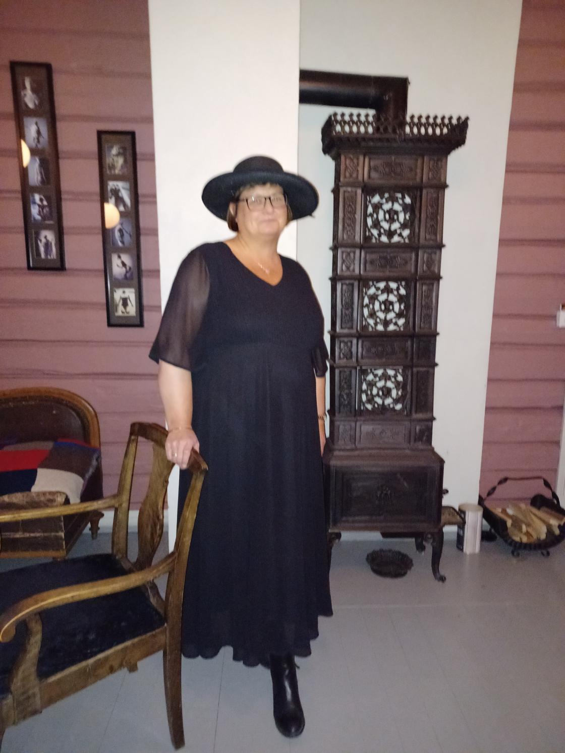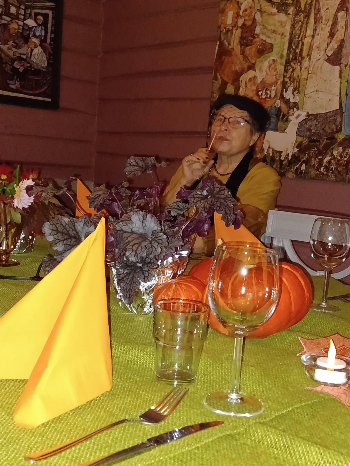Torunn tok pensjonisthatten på da hun fortalte fra pensjonistforeningen. Ellers var hun stilig kledd i 2 svarte kjoler, utenpå hverandre, hun kledde seg om etter middag.