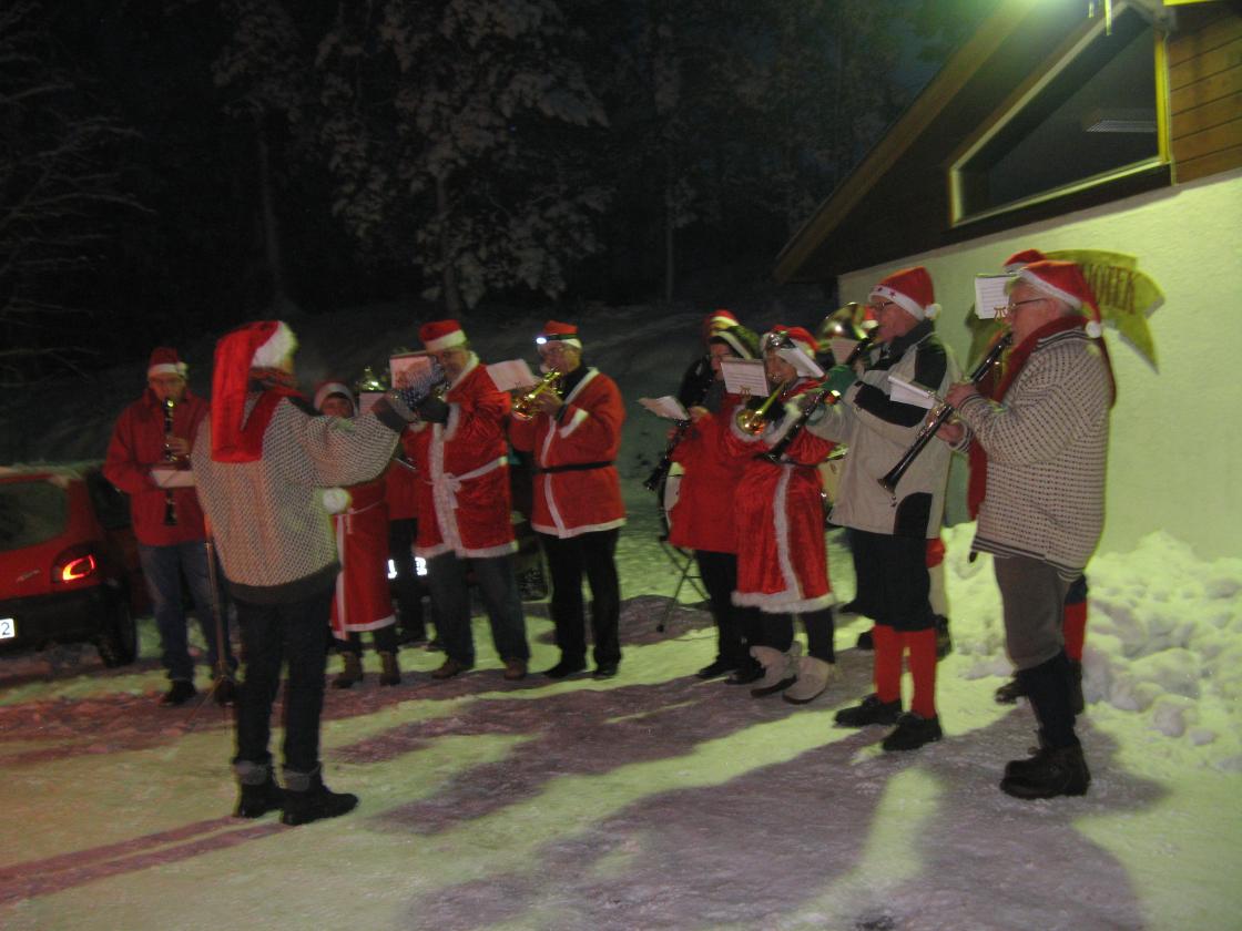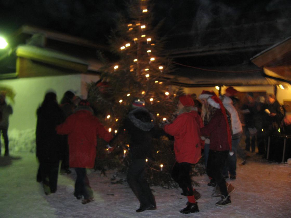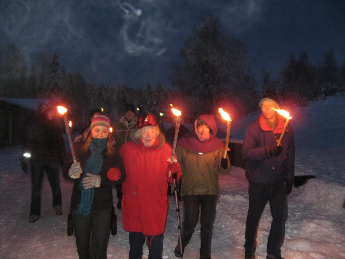 Tradisjonen tro - under snøtunge graner og med kuldegradene bitende i røde kinn gikk vi i fakkeltog gjennom skogen fra Hillestad skole til bygdas storstue, Fjellhall.