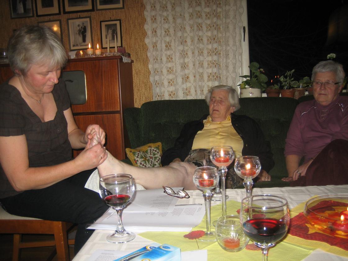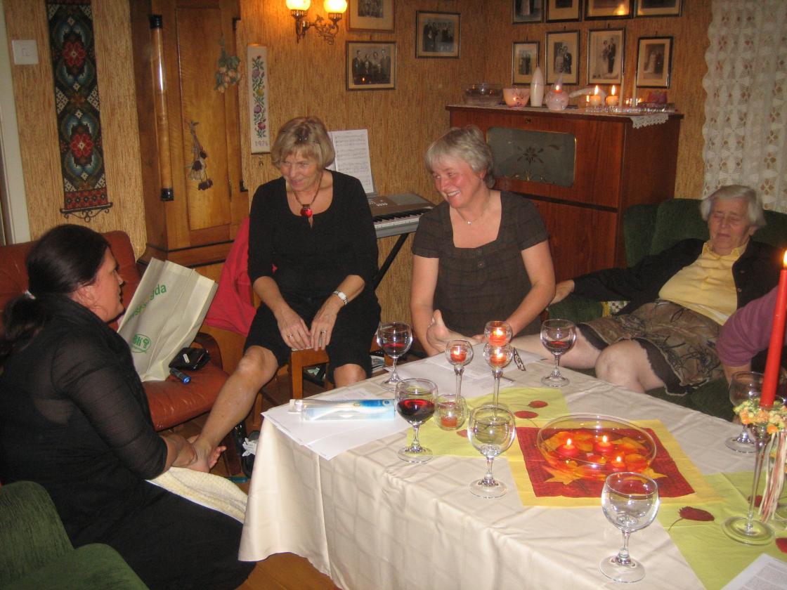"Go'Heksene fra Hof kom mannsterke og bød på fotbad til alle, så Åse Kristines stuer bar etterhvert preg av både vannbaljer og bare bein. Fotmassasje og smørning hørte med. Sammen med litt dikt og vovede noveller som vi rødmet av bare vi leste overskrifta... Et annerledes medlemsmøte, det kan vi trygt si!