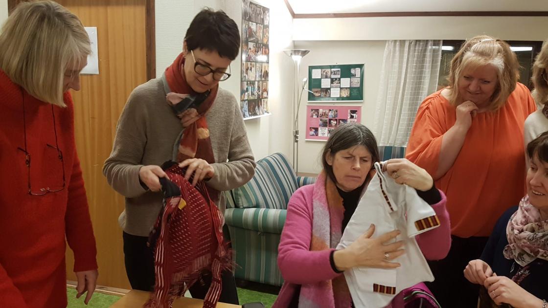 Guatemalsk håndarbeide blir tatt i øyesynav Inger Johanne Gran, Lene K Bråtejordet og bak: Heidi Lofsberg
