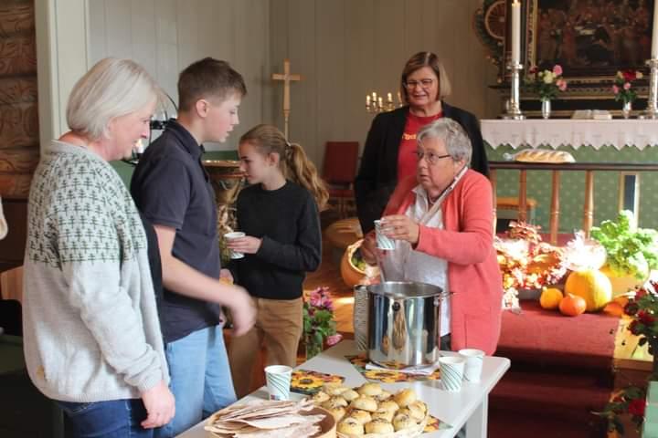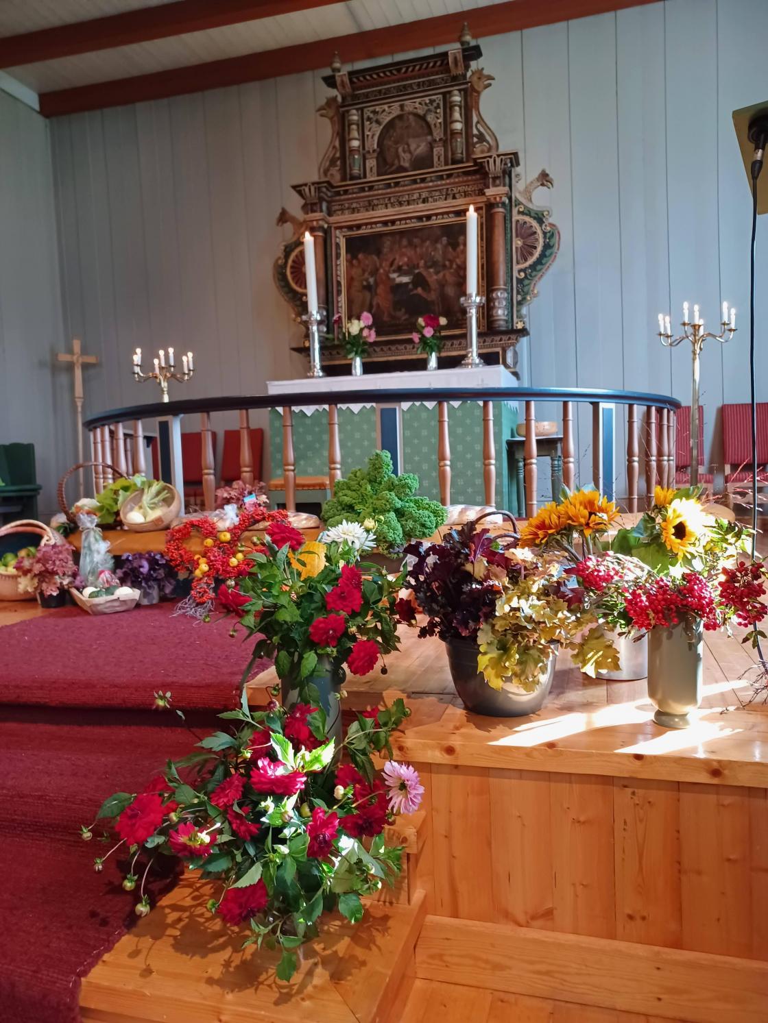 Vakkert pyntet kirke ønsket de frammøtte velkommen til høsttakkefest.