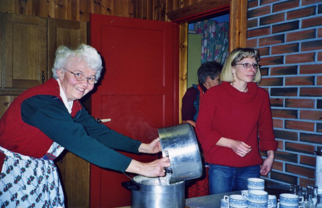 Og Elle-Marie løfter kjeler. Anne K Auen er med i grøtserveringen