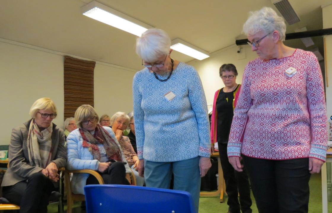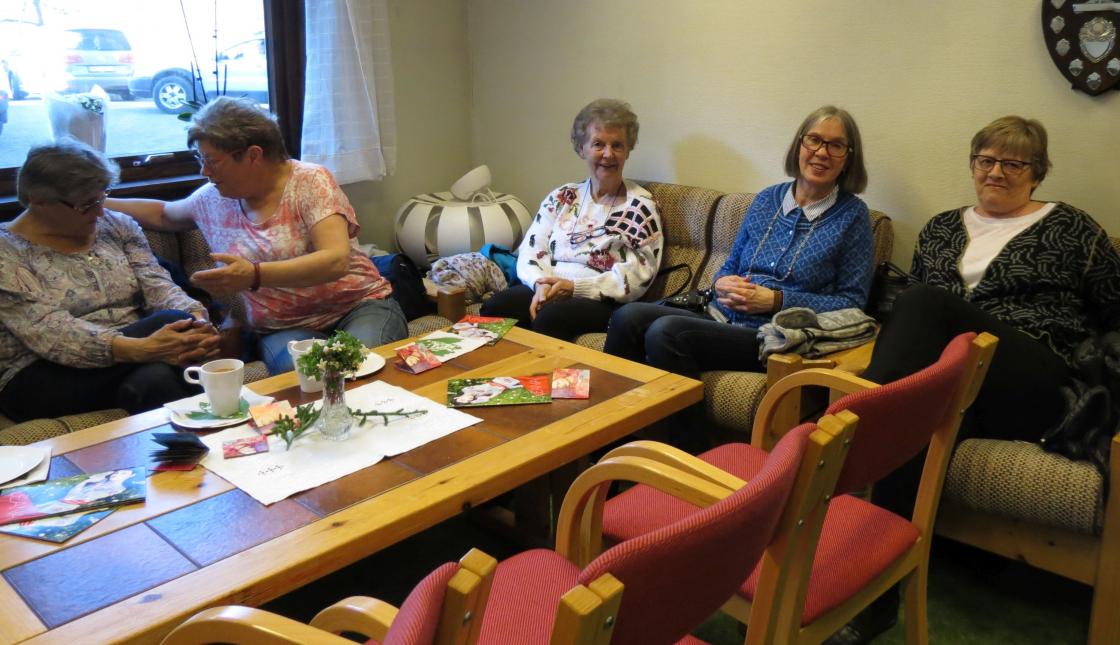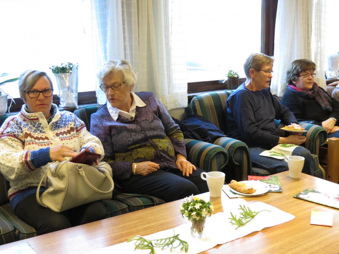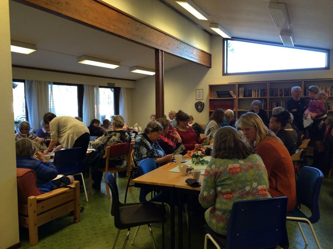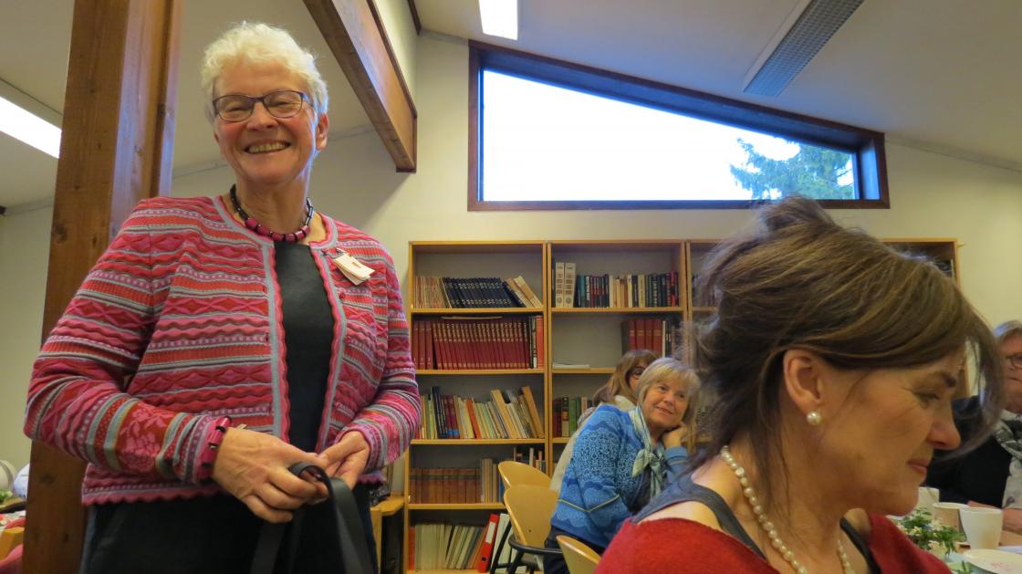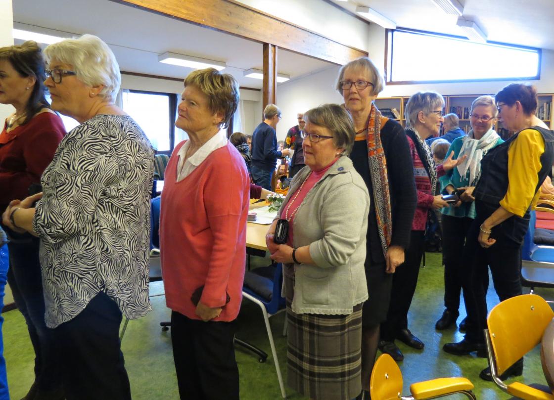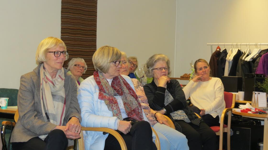 Fargerike damer viste fram noen av de vårlige nyheter som Husfliden i Holmestrand byr på i disse dager. Fullsatt Bygdestue og god stemning med varmt å drikke og munngodt til salgs. Vevstua var også åpen slik at alle interesserte kunne kikke oppom og få "guided tour".