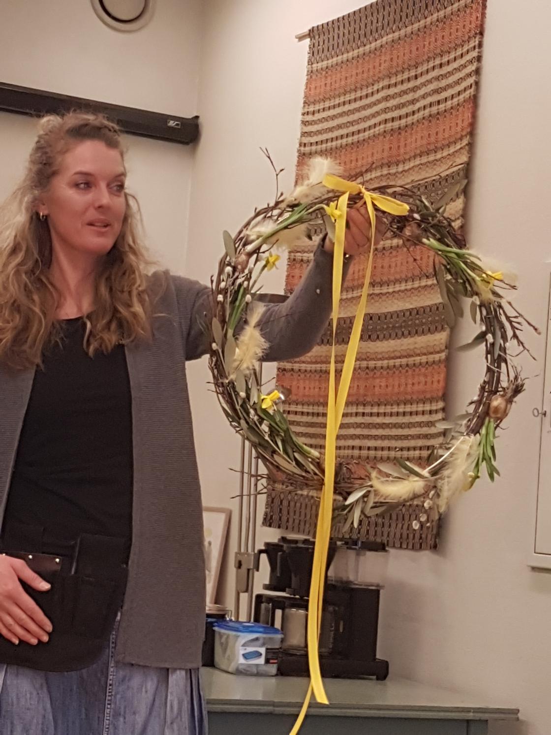 Une Bergan-Haavik fra Blomsterhuset i Hof delte ut en katalog til inspirasjon og viste oss hvordan vi med enkle midler kan lage krans og dekorasjon nå, med påske like om hjørnet. Løkblomster og puselabber pyntet bjørkekransen hun hadde med og potter med ulike løkblomster ble pyntet og loddet ut til heldige vinnere senere. I et større fat bygde hun opp en lekker påskedekorasjon, den ble solgt på auksjon etter utlodningen. Fint ble det og ikke vanskelig å få til, i en eller annen variant kan vi også klare det etter litt inspirasjon og tips om teknikker. Med utdelt rabattkupong ble noen og enhver fristet til å komme til butikken hennes, også utenom åpningstid, ved betaling med Vipps. Hun fikk matbok og drikkebok som takk.