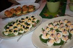 Store deler av kvelden var medlemmene samlet rundt lekkert dekket påskebord og koste seg med eggeretter, silderetter m.m. og godt drikke både svenskt og norskt.