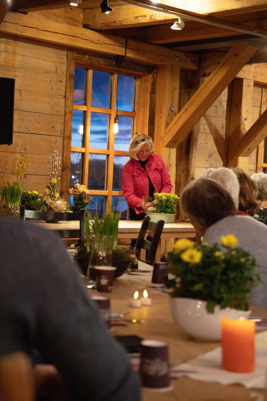 Liv Vadla, som har drive blomsterbutikk på Hjelmeland i 20 år tidlegare, har laga mange oppsett med oase, mose, og pynt. På sjølve møte viste ho oss korleis ein vanleg blomst enkelt kan pyntast opp med nokre bjørkegreiner. Ho ferdigstilte alle dekorasjonar med bjørkegreiner med og utan sopp, mosete grein, blåbærlyng og mange andre materialer ho har hadde henta rett frå naturen.