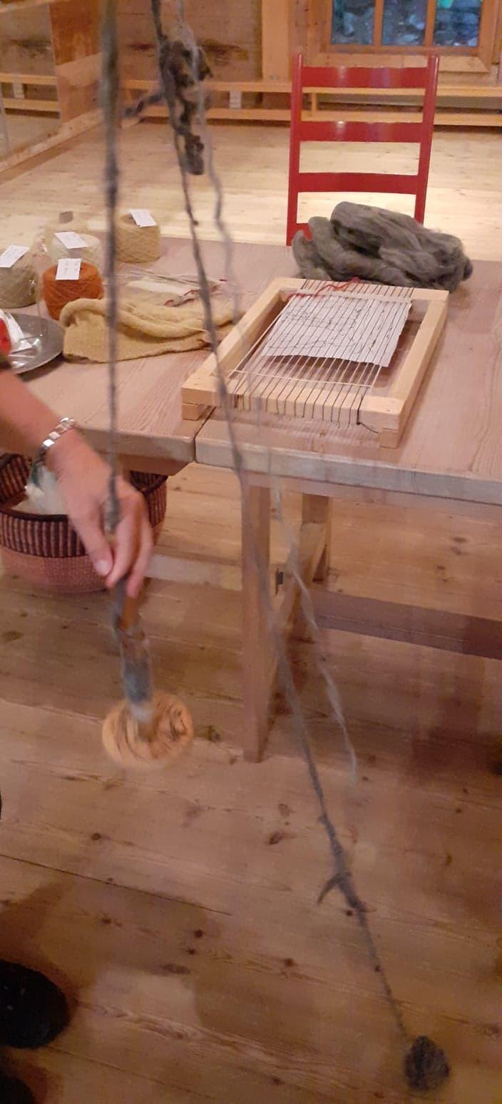 Me fekk sjå korleis ein kan karde ull med kardemaskinen i sving, korleis ein kan spinne garn med håndtein, og vi fekk vevd 8 lapper til seglet ang. rikssamlingsjubileet.