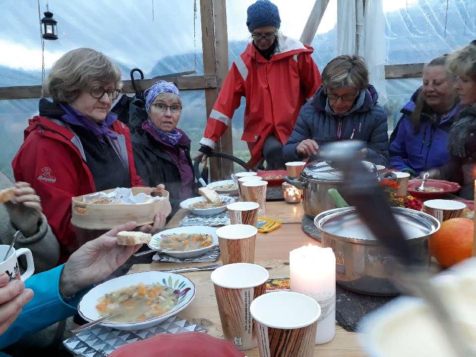 Medlemsmøtet i september. Vi var i Nerols økologiske andelshage. Her var det mykje å sjå, utruleg mange sortar, både kjente og ukjente. I denne hagen er det 17 som har ein andel. Vi var imponert over mangfaldet. Marit fortalde mykje interessant om hagestell, ein lærerik kveld. Etter omvisning og "hagekåseri" vart vi invitert inn i drivhuset. Her var det dekt kosleg til alle gjestene. Vi fekk servert deileg, varm grønsaksuppe, med grønsaker frå hagen sjølvsagt, og heimebaka brød. Kaffi og varm eplekake med is. Moro var det at eplene i kaka var frå hage i Hol. Vi er ikkje bortskjemte med epletre som gir stor , god avling, i hagane her i Hol. Leiaren vår formidla lagssaker. Det dreide seg om referat frå Holsdagen, haustmarknaden, innkjøp av messetelt, aksjon for norsk bygg, sonemøte i Dagali 20. sept. Vi bestemte dato for årsmøtet: onsdag 24. oktober. Tusen takk til Marit, Kari og Tone for fint og godt møte. im