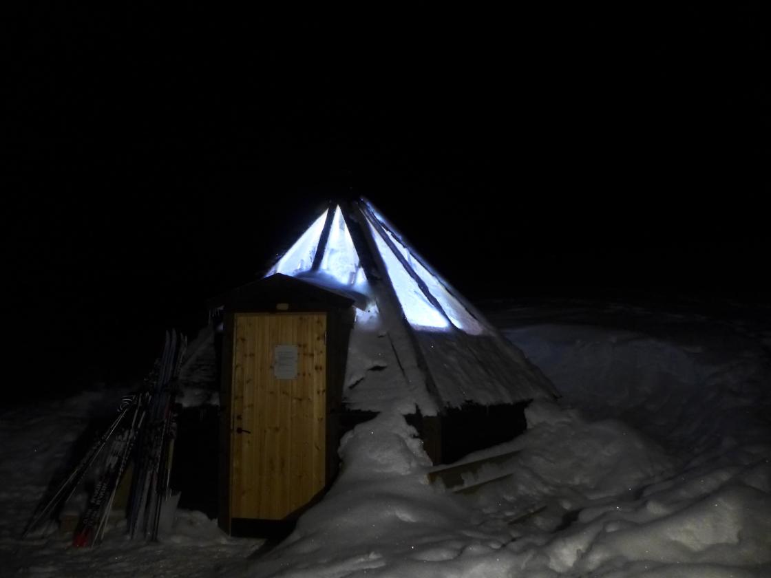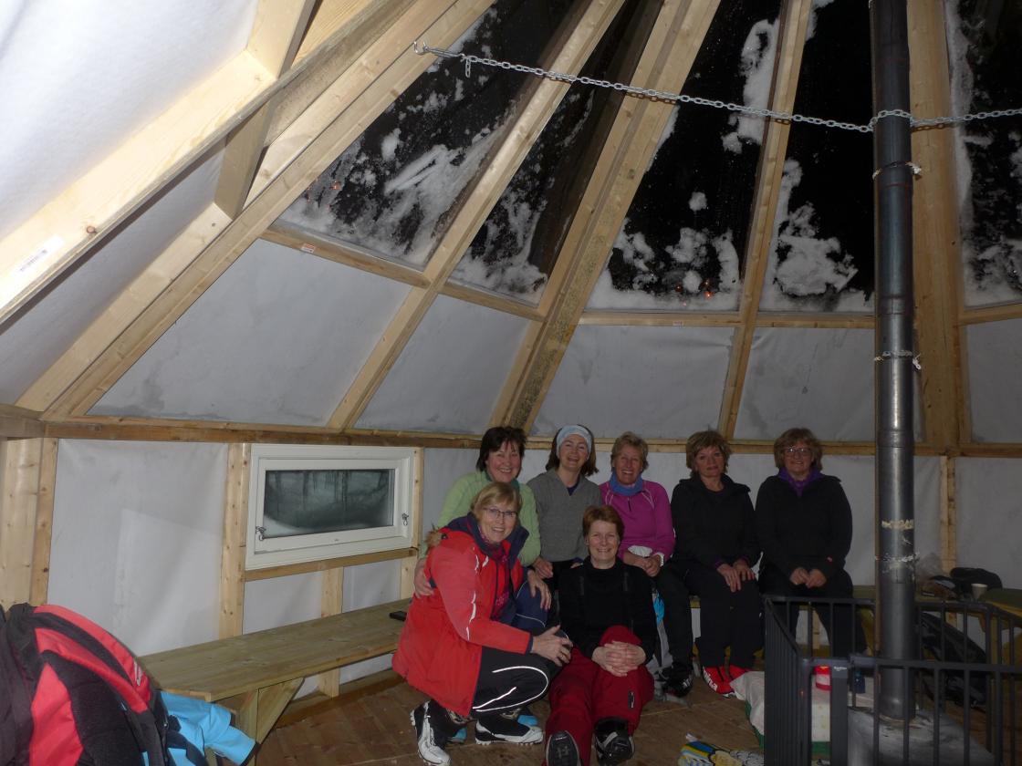 Hol Bygdekvinner på skitur sundag kveld til lavvoen ved Svarttjødn på Holsåsen. Nysethuldra hadde sniki seg i forvegen og fyra i omnen. Så kom resten av gjengen, godt utstyrt med hovudlykter.