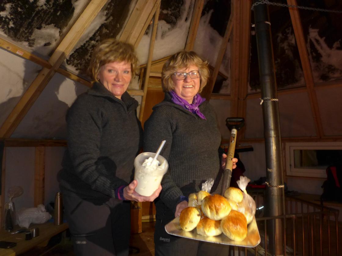 Tusen takk til Randi og Liv Berit som serverte ferske boller i tre variantar og kakao med krem. Krystall stettefatet hadde vi gløymt att heime, men bollene vart servert på det beste vi fann i lavvoen. Bollene smakte herleg! ....saman med kakao og kaffi!