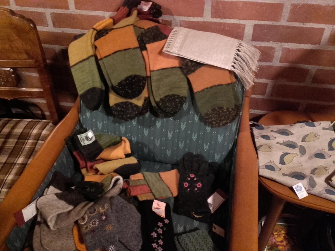 Hun hadde med strikkede sokker og vanter, sydde forklær og flotte vevde linløpere og duker fra damene i Litauen.