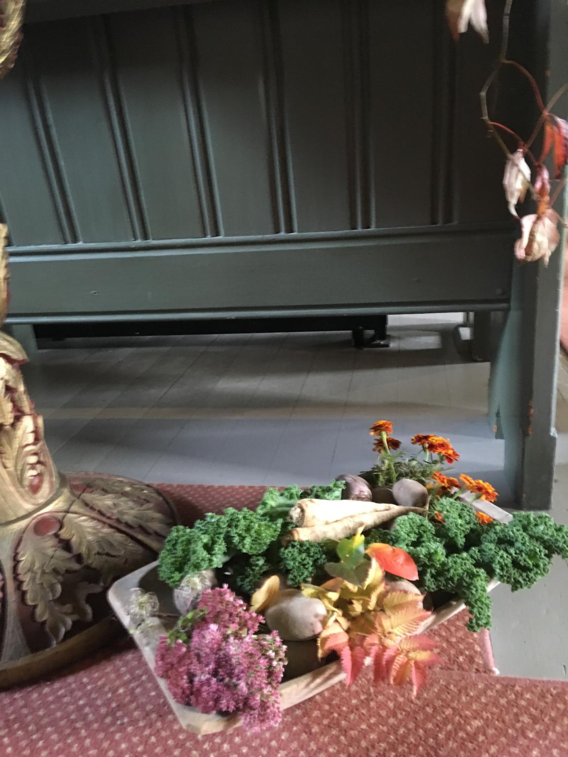 Fire av Bygdekvinnelagets medlemmer pyntet i kirken til høsttakkefesten. Det var også gullkonfirmanter tilstede denne søndagen. Vi fikk både ros og takk for oppdraget.