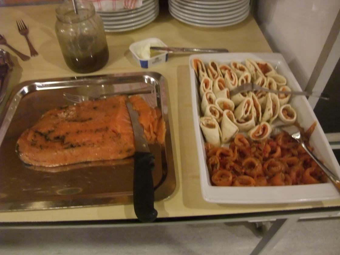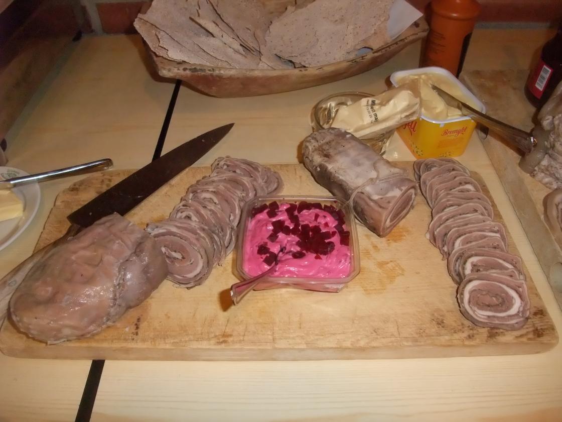 Så var det tid for bespisning, deilig julemat! Mette hadde holdt kurs i julemat uka før, og hun hadde tatt med noe av dette til møtet. Det var ribberull, lammerull, leverpostei, gravlaks m.m., samt brød og flatbrød.
