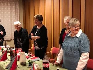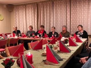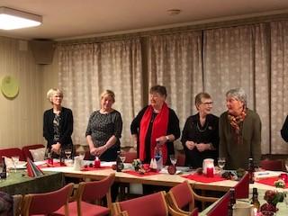 Leder Torild Sønsthagen ønsket velkommen og kvelden ble innledet med julesangene jingle bells og det lyser i stille grender med vår dyktige sanger Hildegard Søli Berge som forsanger. Lukten av god julemat spredde seg på Fredheim og det var god stemning med mye prat og latter. Leder hadde en overraskelse til de fremmøtte. Det var limt lapper under tilfeldige stoler og den heldige kunne ta med seg en blomst hjem. Kveldens store overraskelse på lappen var gratis konsert med Black and Lekker 12.12. Hildegard oppfordret oss andre som gikk glipp av gratisbilletten til å løpe å kjøpe billett, for dette er en konsert som er verdt å få med seg.