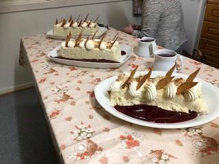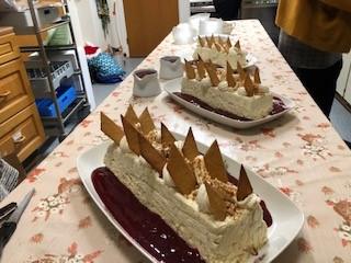 Det ble sunget nå har vi vaska gulvet og dreaming about a white christmas før desserten ble servert. Desserten var kveldens andre overraskelse og helt i bygdekvinnenes ånd. Det var store flotte byggrynsfromasjer med rød stikkelsbærsaus laget av kokken Hildegard. Fromasjene var pyntet med pepperkaker og mandler.