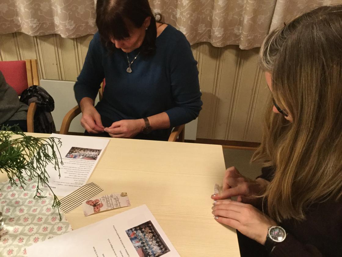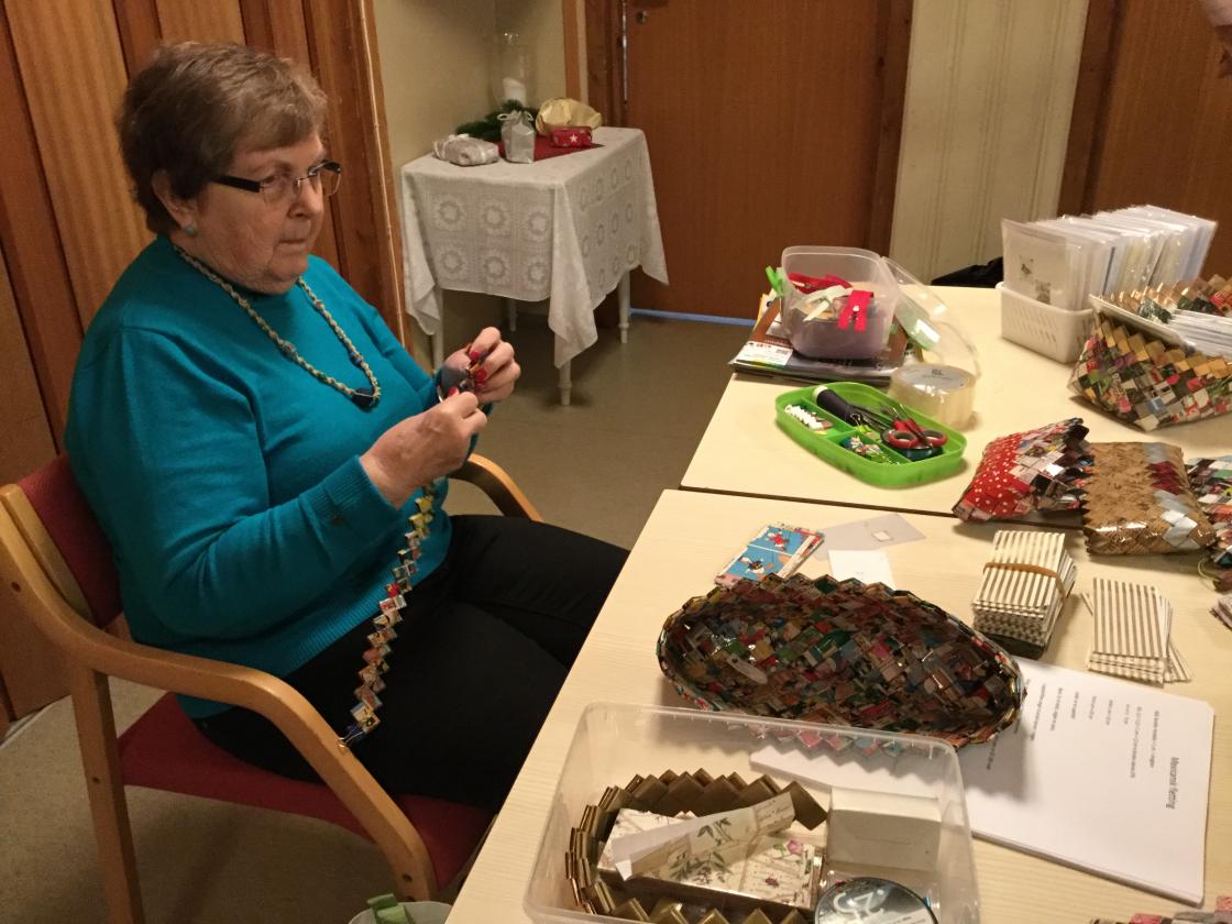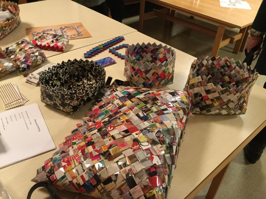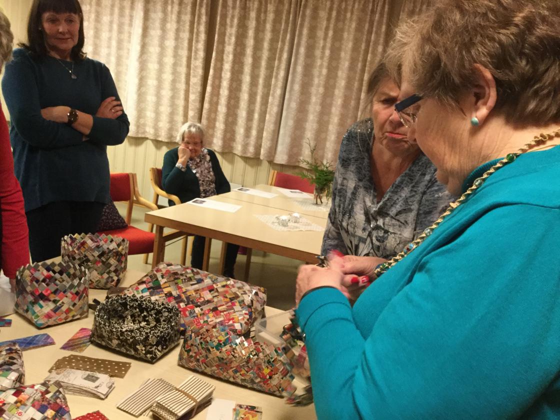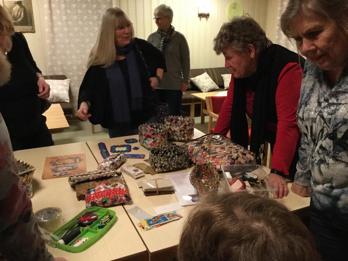 Vi hadde besøk av Jorunn Helgestad fra Hvittingfoss som har drevet med dette i flere år. Hun viste oss hvordan det gjøres fra bunnen av og noen prøvde også flette selv. Meksikansk fletting er en flott gjenbrukshobby hvor man bruker aviser, tegneserier, ukeblader, reklamepapir, kataloger, kaffeposer, teposer, sjokoladepapir og lignende til å lage punger, vesker, kurver, mapper og boller. Man klipper og fletter papiret, deretter sys det sammen. Se bilder.