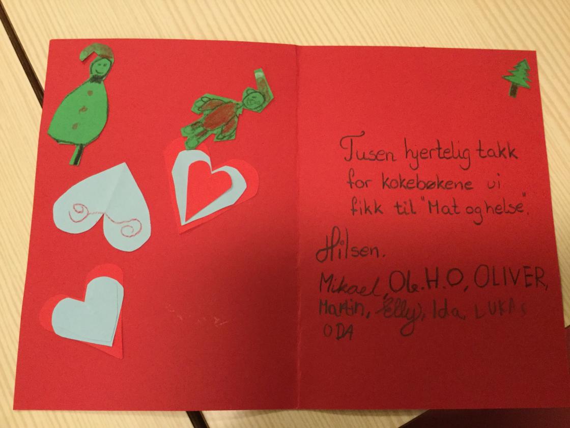 Vi hadde fått et hyggelig kort med takk fra elevene i 6. klasse for kokebøkene de hadde fått av laget.