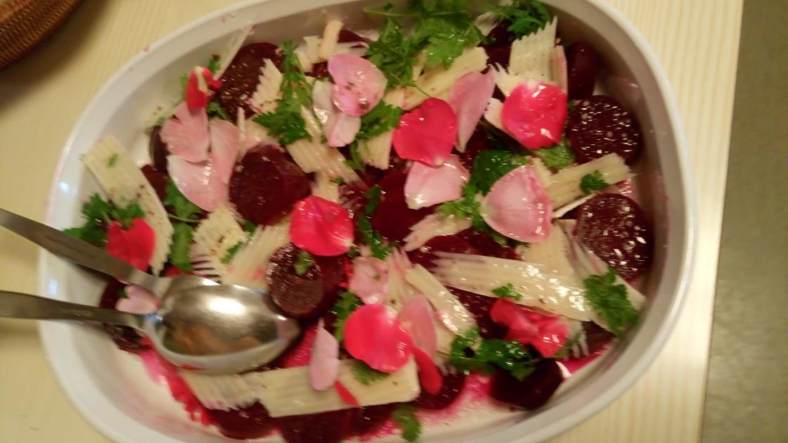 Pyntet med blomster fra roser, stemor og ringblomster ble det bare lekkert, og alt smakte veldig, veldig godt!