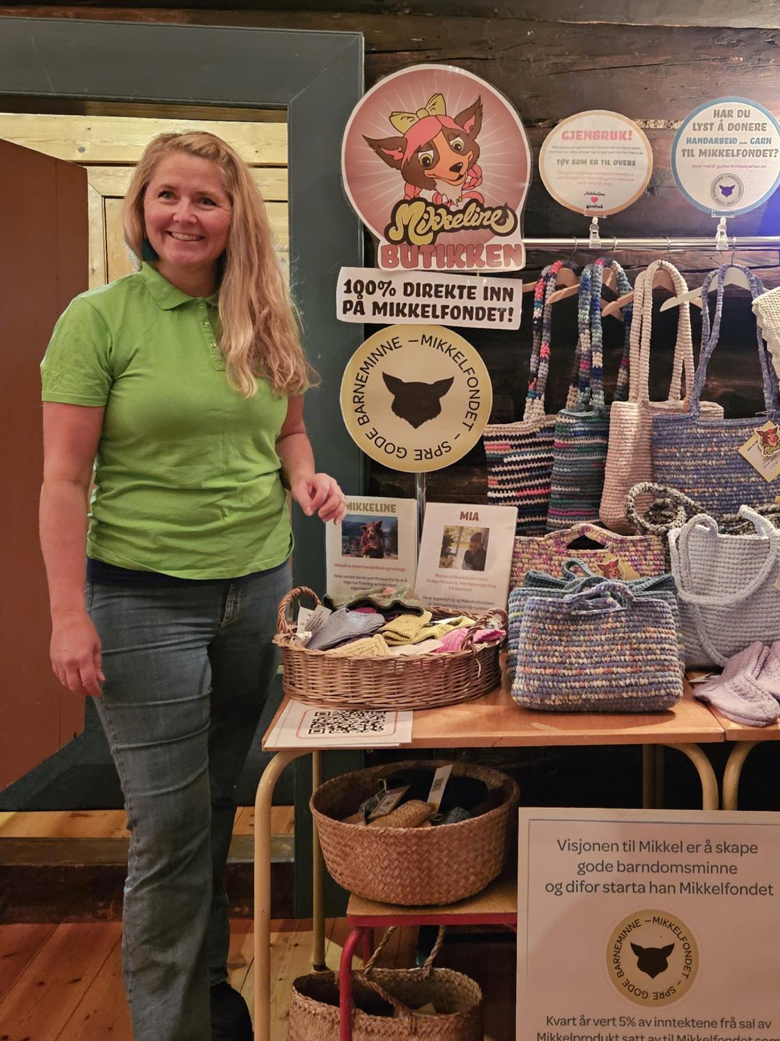 Ho viste fram vesker og anna hekla av gamalt sengetøy, flotte strikkeplagg av restegarn og andre gjenbruksprodukt. Overskotet i Mikkelinebutikken går til Mikkelfondet og vidare til born som treng det. Dei samarbeidar med veldedige organisasjonar.