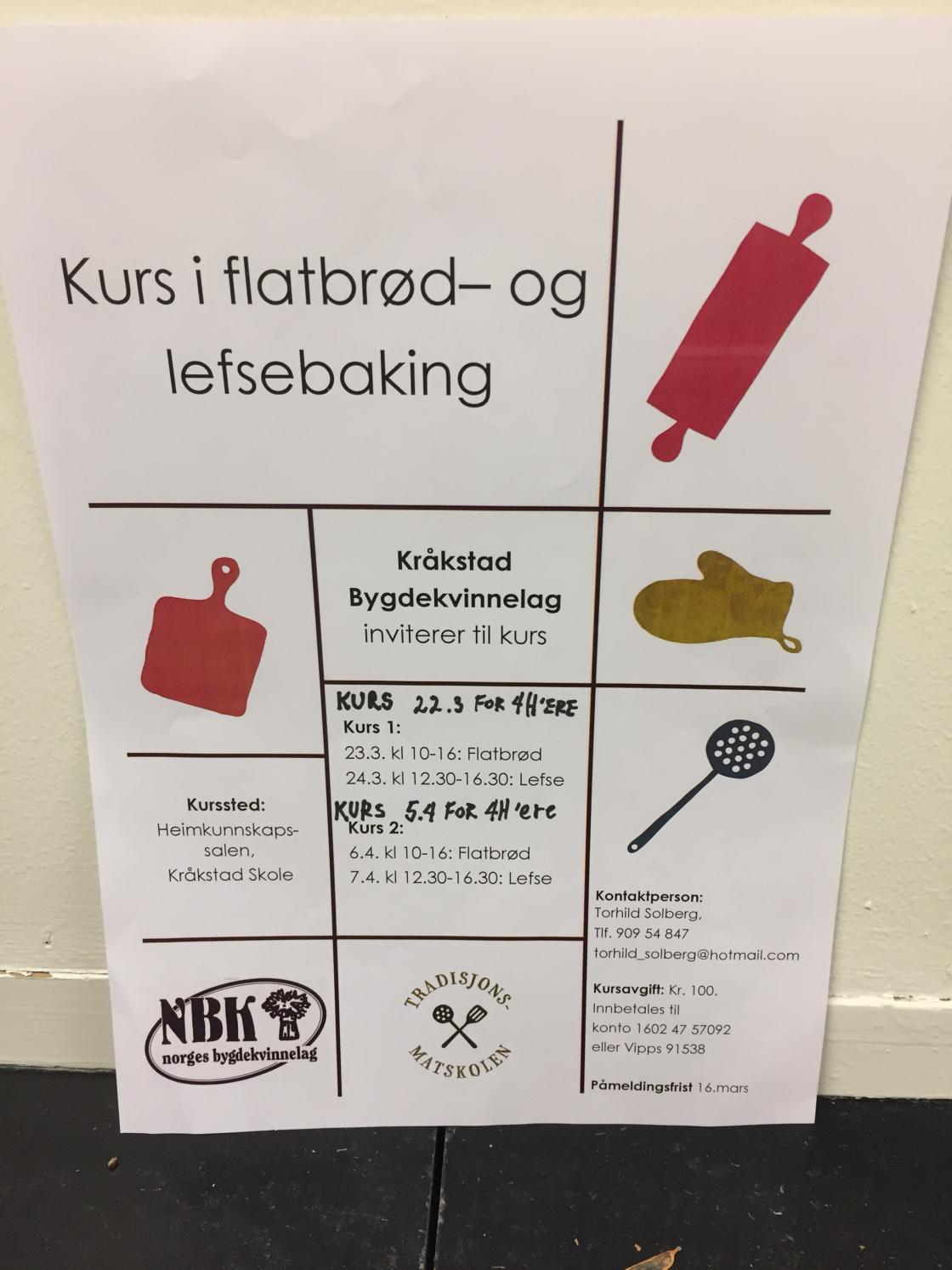 Kråkstad Bygdekvinnelag holder kurs i lefse og flatbrødbaking for Bjerke 4H i Kråkstad. Mattradisjonskursene foregår i mars og april på heimkunnskapssalen på Kråkstad Skole.
