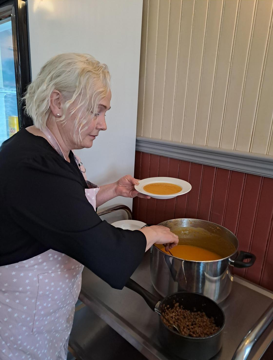 Innimellom var det salg av nydelig suppe, kaffe og kaker. Brystkreftforeninga og Maske AS bandasjist var også på plass med stands .