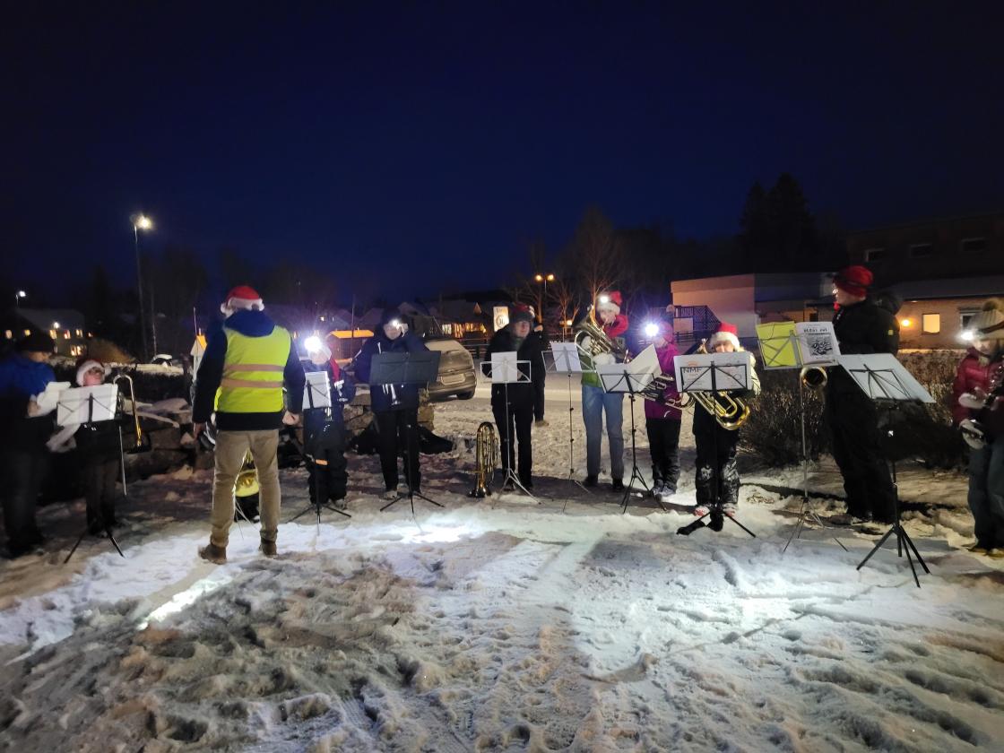 Der spilte Lardal Musikk Korps julesanger og gang rundt juletreet ble det. Et gledelig møte for alle barn ble det også når julenissen kom med nisseposer.