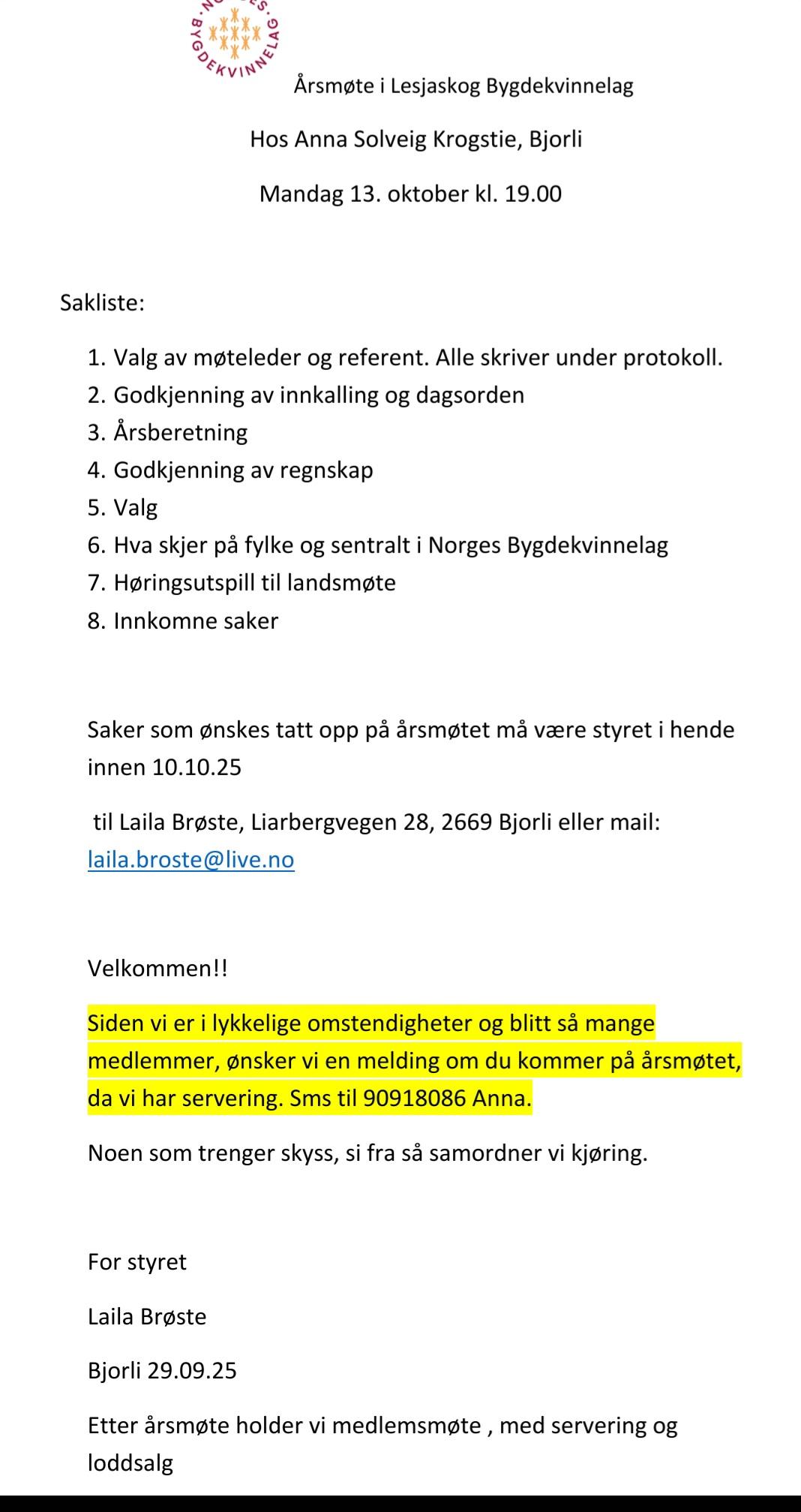 Årsmøte i Lesjaskog Bygdekvinnelag