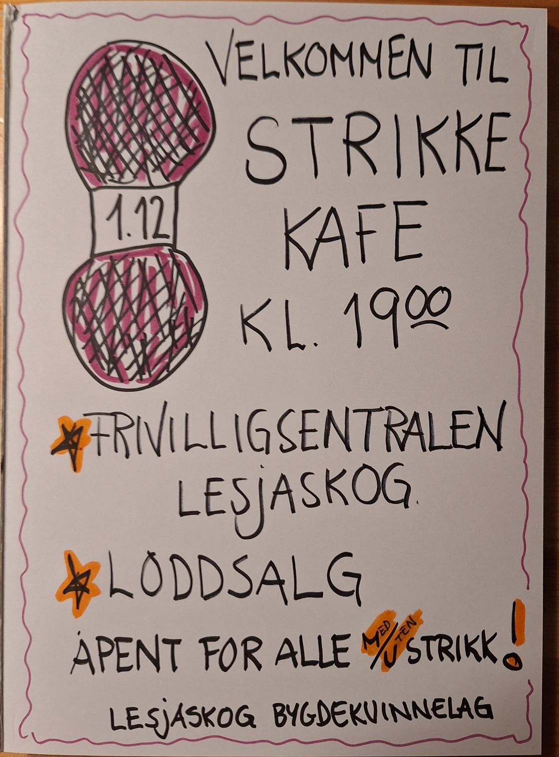 Hyggelig stund med eller uten strikketøy.salg av kaffe/vafler til inntekt frivilligsentralen. Loddsalg. Åpent for alle