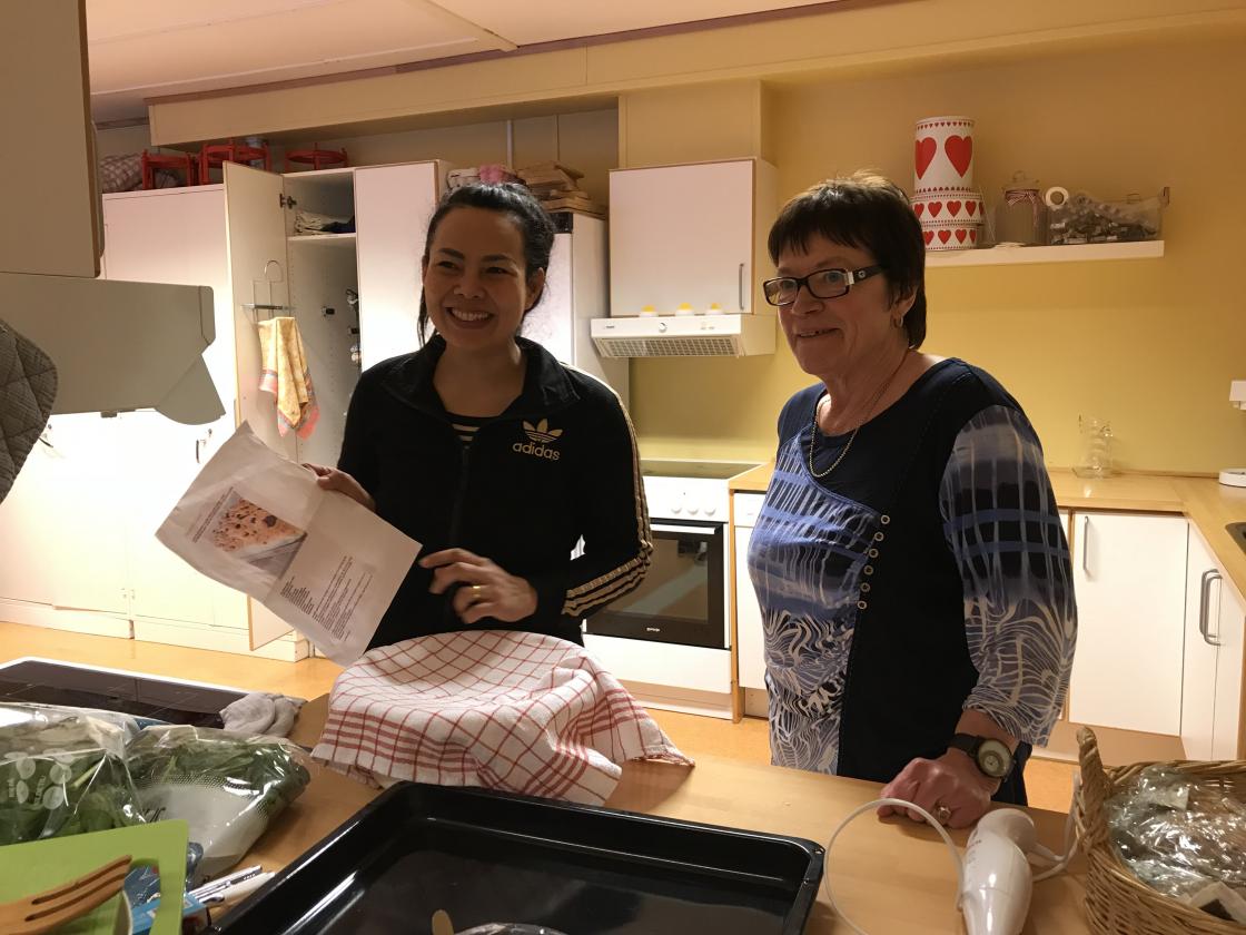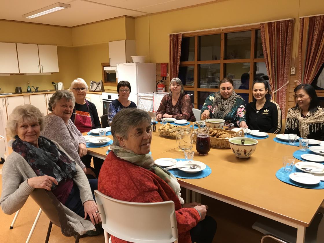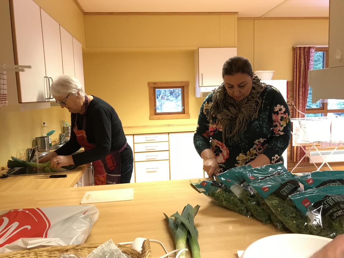 På menyen sto spinat- og grønnkålsuppe som Anne Lise hadde sørget for oppskriften til. Det begynte snart å dufte herlig av hvitløk og andre grønnsaker og krydder på kjøkkenet. Samarbeidet gikk utmerket, og snart sto også foccaciadeigen til heving. Mens vi ventet på maten gikk praten livlig, mest på norsk og littegrann på fingerspråket. Flere flittige damer hadde også tatt med strikketøyet, det kom selvsagt også fram mens vi ventet.